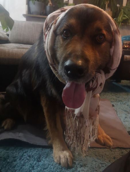 Bei schlimmen Gewittern kommt eine unserer Silvestermaßnahmen zum Einsatz. Leider geht das Geböller bei uns zwei bis drei Tage vor dem Jahreswechsel los und dauert danach noch tagelang an. Weil Bruno die Zeit in ständiger Panik verbringt, haben wir irgendwann begonnen, Bruno Tücher um den Kopf zu wickeln, um die Geräusche zumindest etwas abzuschwächen. Er ist ein Hund, dem solche Dinge ziemlich egal sind und hat nie versucht, die Tücher abzustreifen oder überhaupt irgendeine Reaktion auf seinen Kopfschmuck gezeigt.