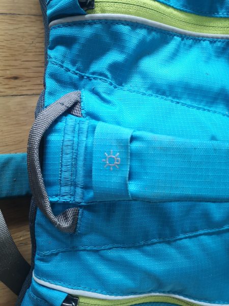 Das Material ist stabil und wasserabweisend. Dinge, die nicht nass werden dürfen (bspw. Trockenfutter), packen wir aber zur Sicherheit immer nochmal in Beutel ein. bevor sie in den Rucksack kommen.