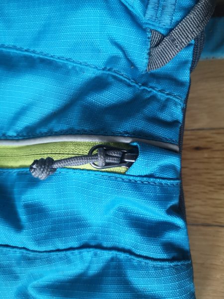 Die Details sind durchdacht gemacht, die Reißverschlüsse haben eine kleine Abdeckung am Ende, die Taschen haben nochmal eine Unterteilung, das Geschirr hat einen stabilen Griff inklusive Befestigungsschlaufe für ein Blinklicht.