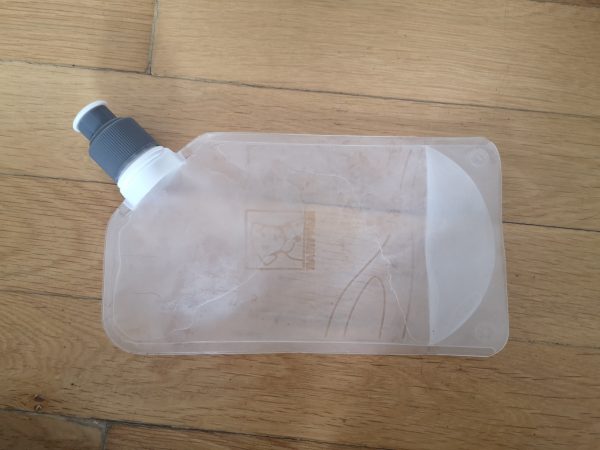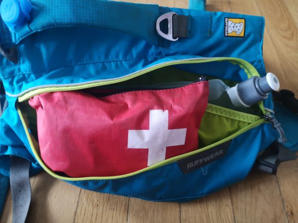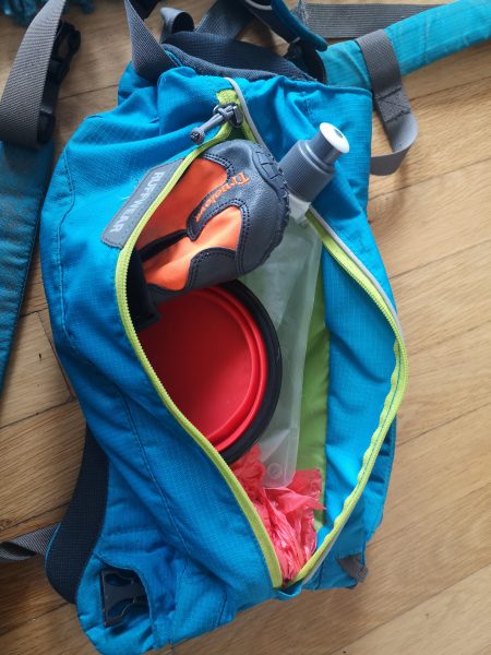 Zum Singletrak gehören auch zwei faltbare Trinkflaschen mit je 0,6 Liter, die perfekt in die Taschen passen. Zusätzlich zu den Flaschen haben wir normalerweise folgende noch einen faltbaren Napf, einen Pfotenschuh, ein Erste-Hilfe-Set und Kotbeutel im Rucksack.