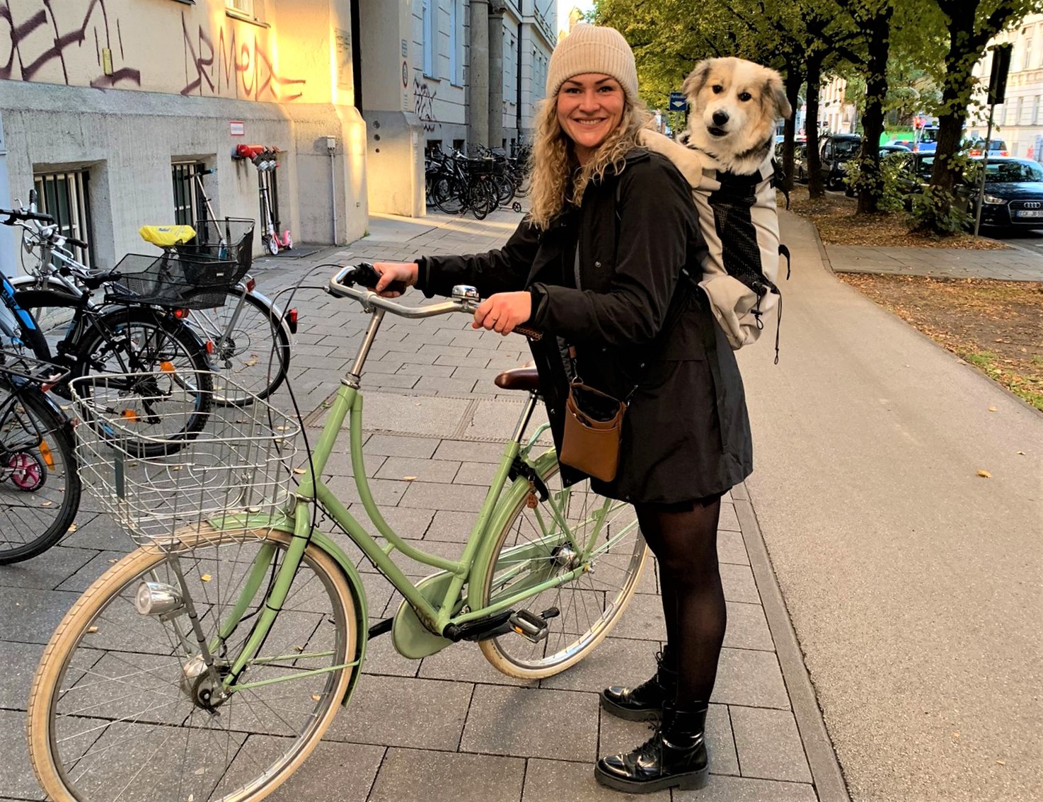 Eine Frau mit Mütze hält ihr Fahrrad und lächelt Richtung Kamera. Auf ihrem Rücken hat sie ihren Welpen im Rucksack.