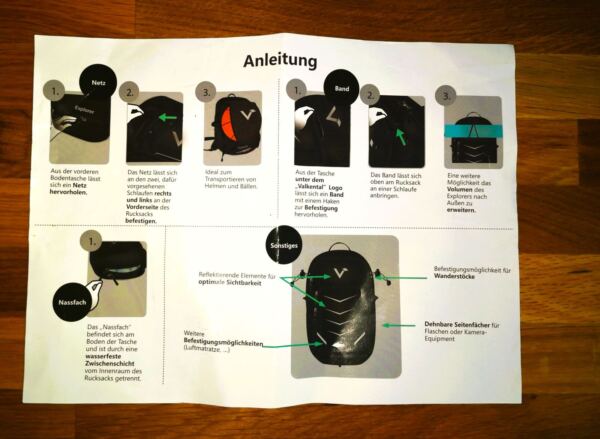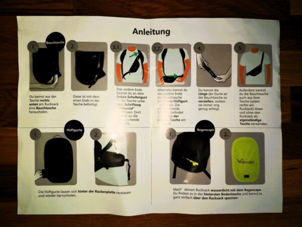 Bei Lieferung waren wir ein wenig überrascht, eine „Bedienungsanleitung“ für den Rucksack zu finden. Aber das ist bei diesem Rucksack durchaus sinnvoll, weil er zahlreiche Zusatzfunktionen und „Gimmicks“ hat, die man so viel schneller erkunden kann.