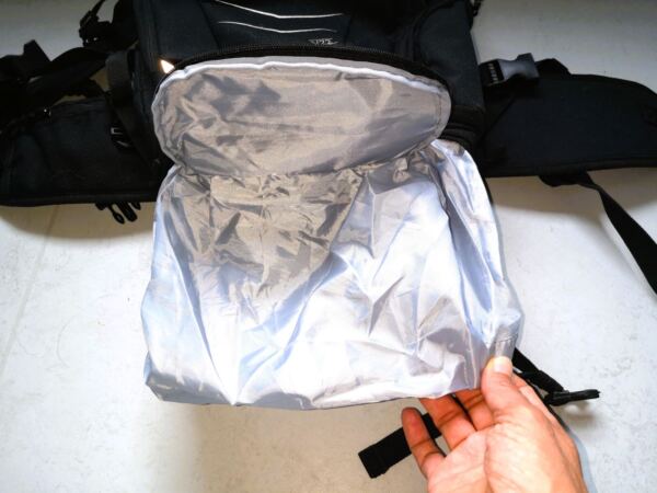 Bei leichterer Beladung haben wir die Hüftgurte verstaut, das ergab zusätzliche Polsterung am unteren Rücken. Und wenn wir zusätzliche sperrige Dinge transportiert haben – in einem Fall einen Fahrradhelm – haben wir das in der Bodentasche eingelassene Netz genutzt. Eine Isomatte ließ sich wunderbar an einer der Schlaufen befestigen, so hat sie beim Wandern nicht gestört. Auch die Wanderstöcke können an den Seiten so fixiert werden, dass sie nicht gegen die Hüfte oder die Schulter drücken. Das Regencape ist schnell aus dem entsprechenden Fach geholt und groß genug, um Rucksack und daran befestigte Teile vor Wasser zu schützen.