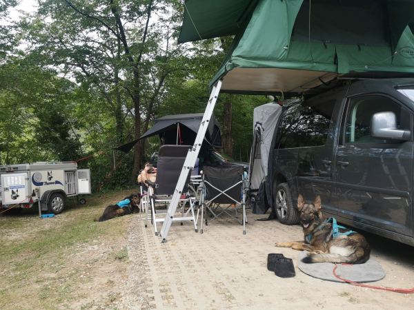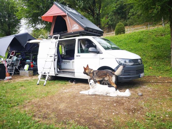 Es gibt viele Dachzelt-Fans, die ihre Hunde mit aufs Dach holen. Von Malis und Schäfis wurden uns auch schon Videos gezeigt, wie sie sich auf einer Matte auf der Frontscheibe lässig abstoßen und ins Zelt springen oder auf der Leiter selbstständig vom Boden ins Zelt und zurück wechseln.