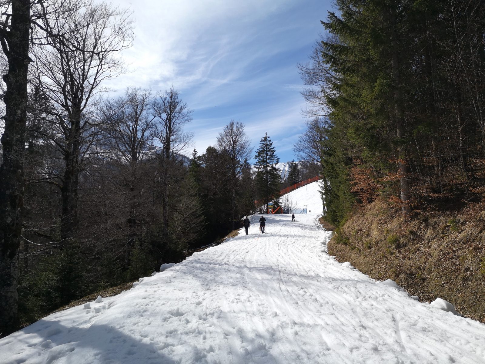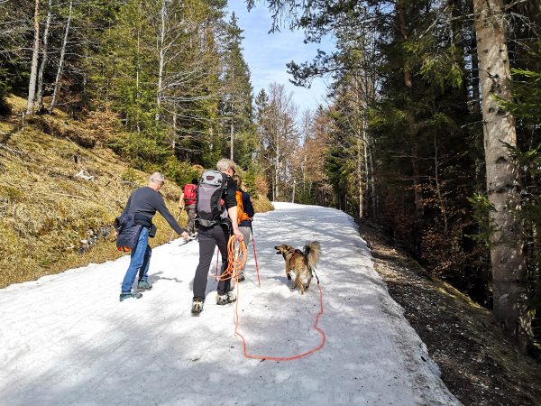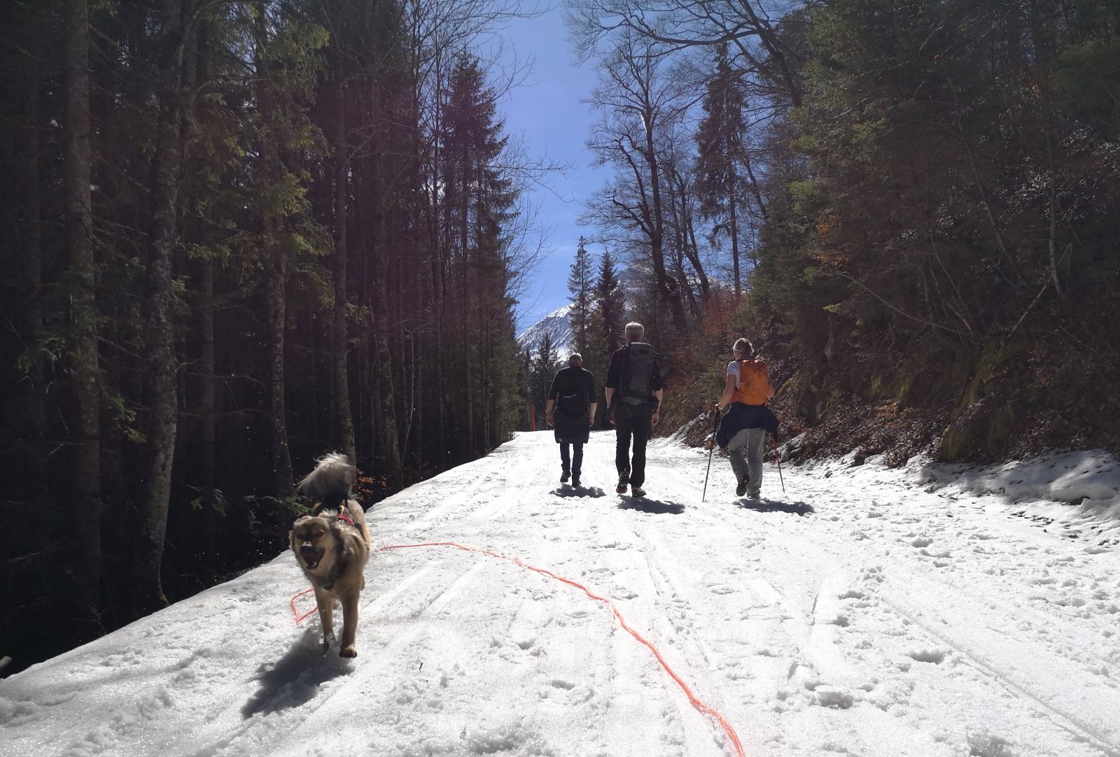 Auf dem Winterwanderweg bergauf zum Riederbergstüberl. Auf der gesamten Strecke freut sich Amos über den unverhofften Schnee.