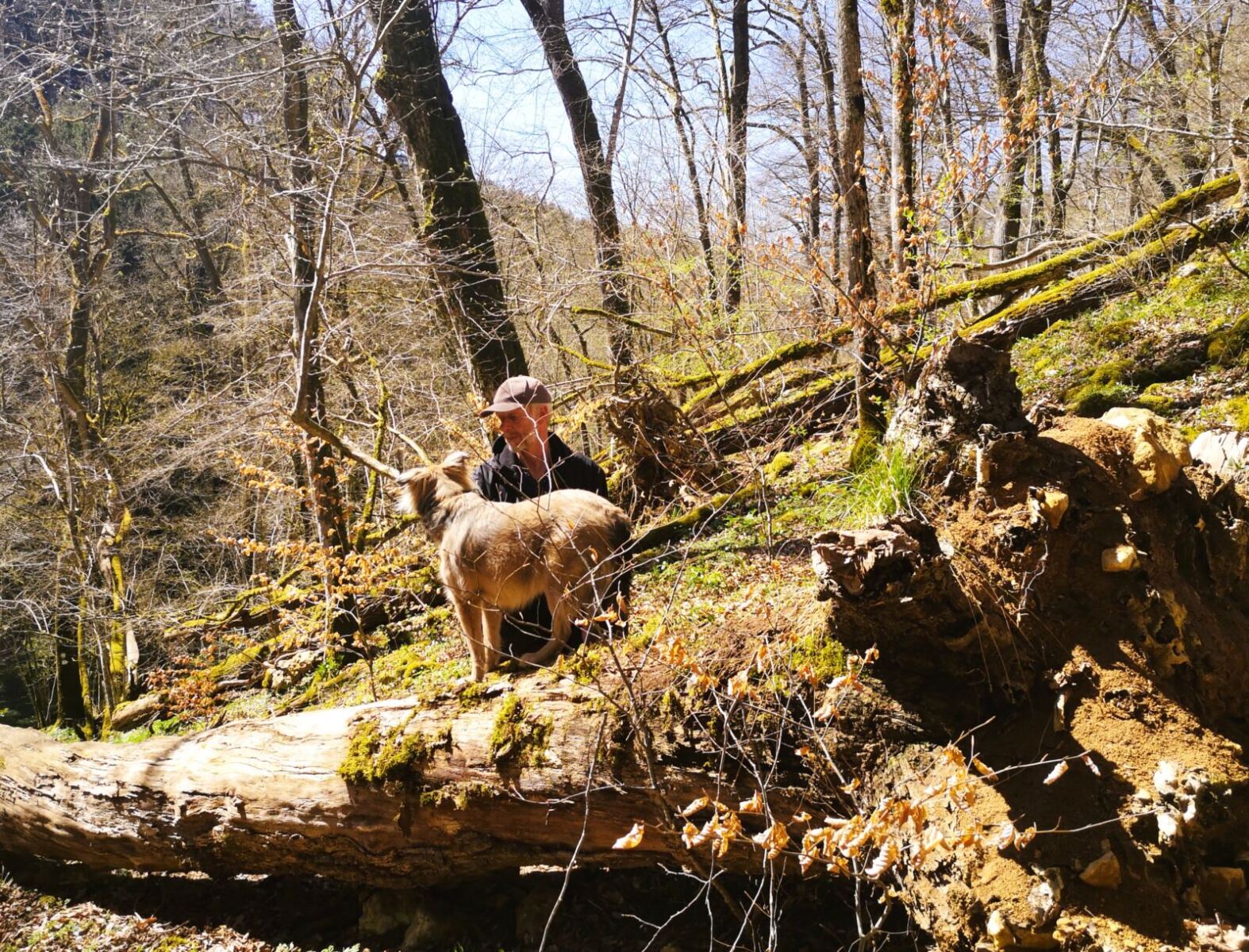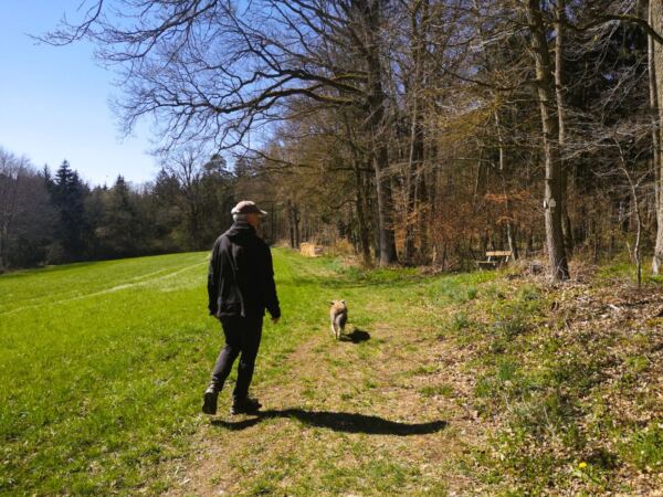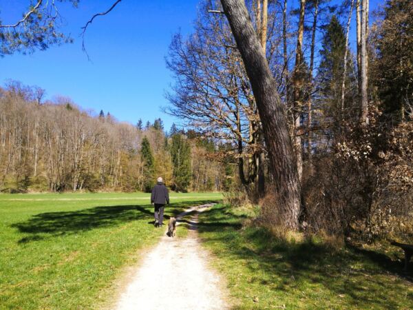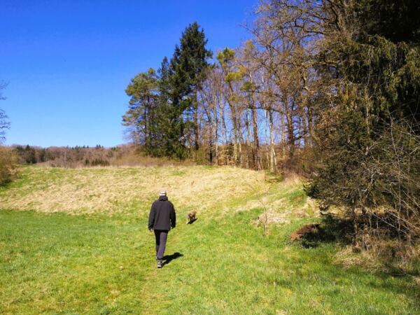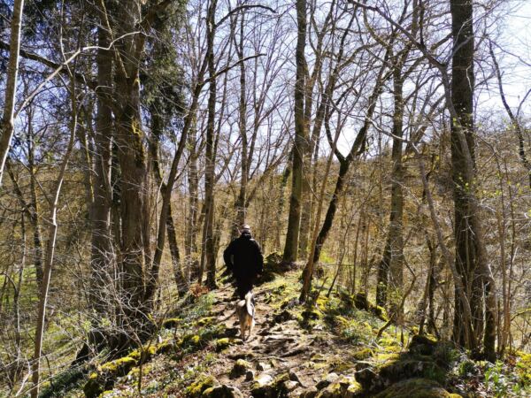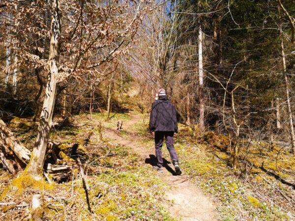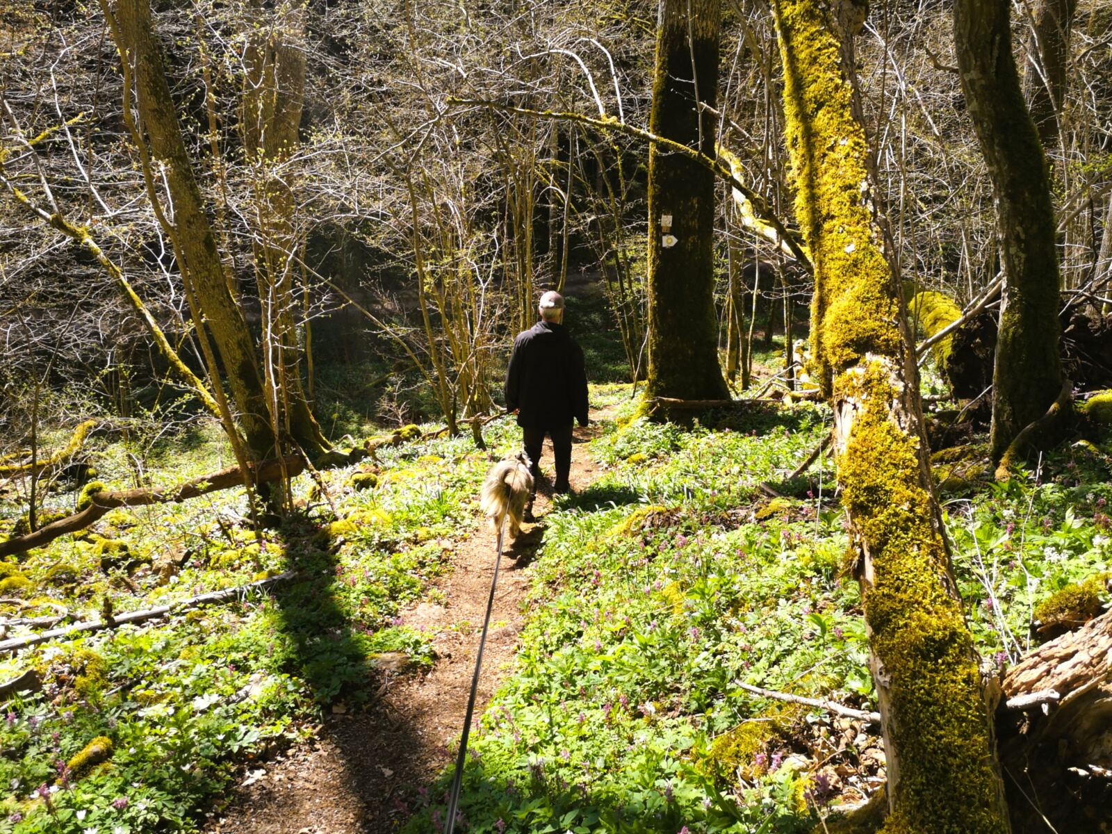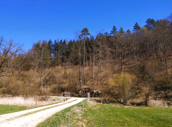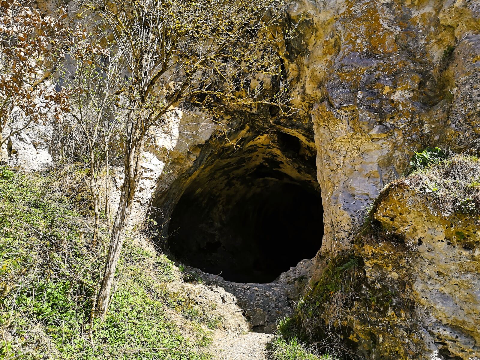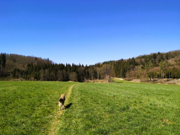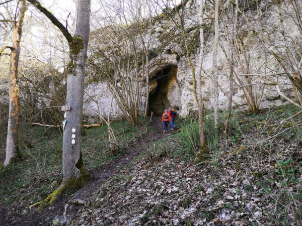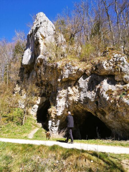 Der Weg führt uns am bewaldeten Hang entlang, links von uns offenes Gelände. Schon nach wenigen Metern passieren wir die Salzbühlhöhle, eine kleine, aber eindrucksvolle Karsthöhle, die durch das Wirken von Wasser und Kalkstein über Jahrtausende entstand. Unser Hund findet, dass es am Höhleneingang ziemlich spannend riecht.😊