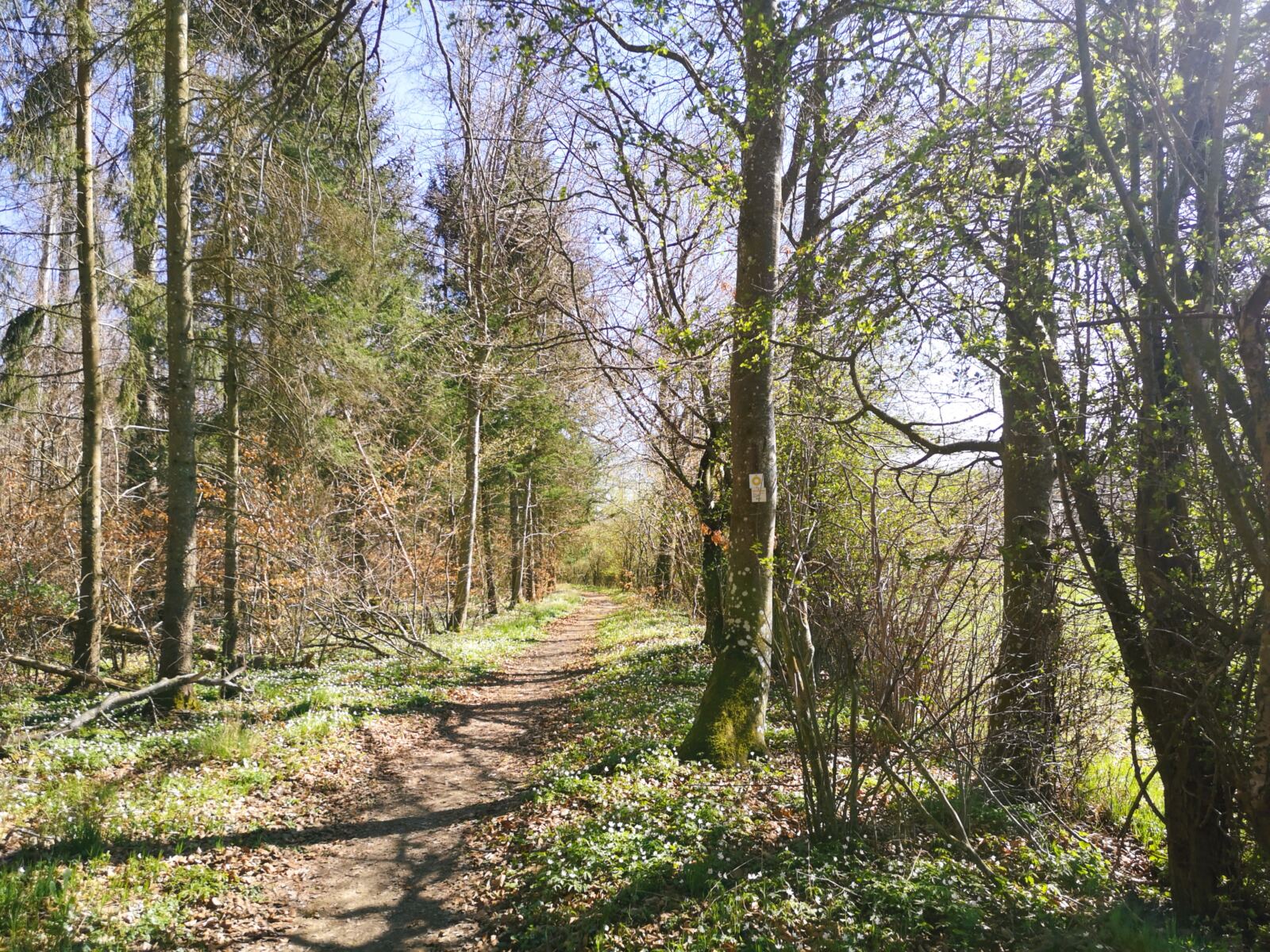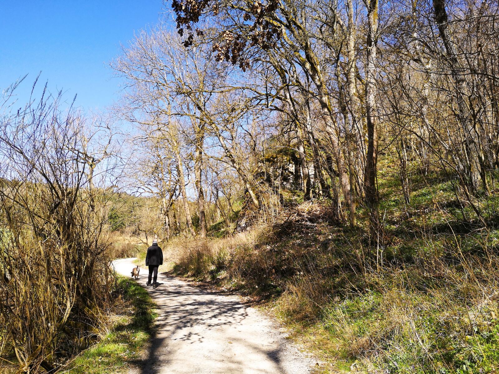 Der über seinen gesamte Verlauf bestens beschilderte bzw. markierte Wanderweg bringt uns durch Wälder und über Wiesen, auch mal neben Feldern am Waldrand entlang. Sonne und Schatten wechseln sich ab. Der Weg verläuft weitgehend eben. Nur sanfte Auf- und Abstiege zwischendurch. Unter Füßen und Pfoten: überwiegend naturbelassene Pfade, abschnittsweise auch sanft gekieste Wirtschaftswege. Kurze Abschnitte geteert. Sonne und Schatten wechseln sich ab. Auch wenn der Weg abschnittsweise an der Lone entlangführt, solltet ihr unserer Erfahrung nach Extra-Wasser für den Hund einpacken. Denn selbst im Frühling nach Regen führt der Flusslauf kein Wasser. Jedenfalls haben wir es noch nie darin plätschern sehen. Auch nicht auf dem nahen, ebenfalls sehr schönen Neandertalweg.