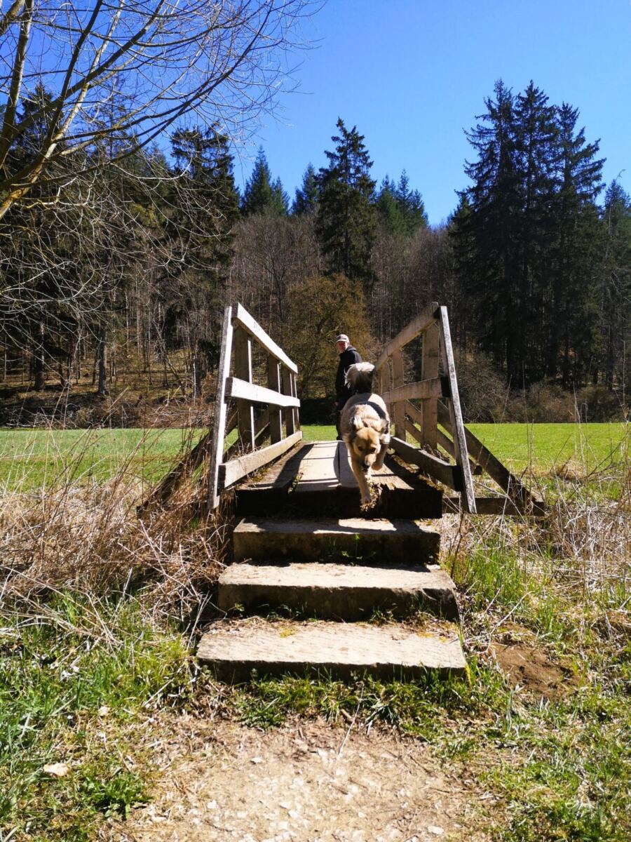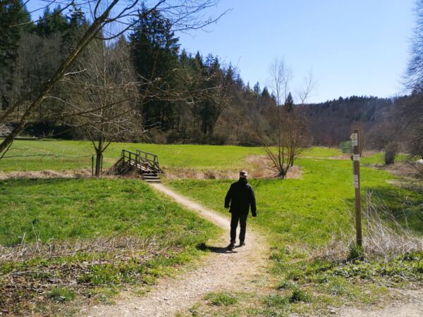 Der offizielle Weg bringt uns am Waldrand entlang, dann auf einem befestigten Weg, der um eine Lichtung herumführt und wieder über eine Brück über die Lone. Vom Wirtschaftsweg biegt schließlich links ein Pfad ab. Er führt uns über eine weite Wiese ins Trudeltal, weiter über eine Brücke über die Lohne und dreht dann nach rechts. Am Waldrand laufen wir weiter, dann steigen wir durch den Wald hinauf ins Eschental.