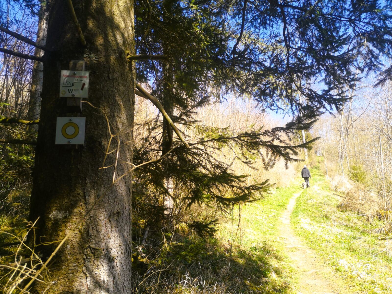 Nach einer kleinen Rast geht`s weiter. Der offizielle Weg führt uns über den Waldbuckel zurück auf den Hauptweg. Wir laufen einfach ein Stückchen parallel dazu auf der gegenüberliegenden Seite der Lichtung. Unser Weg wird schließlich wieder auf den offiziellen Wanderweg stoßen.