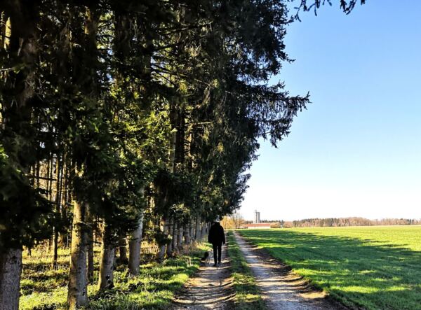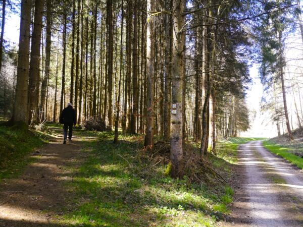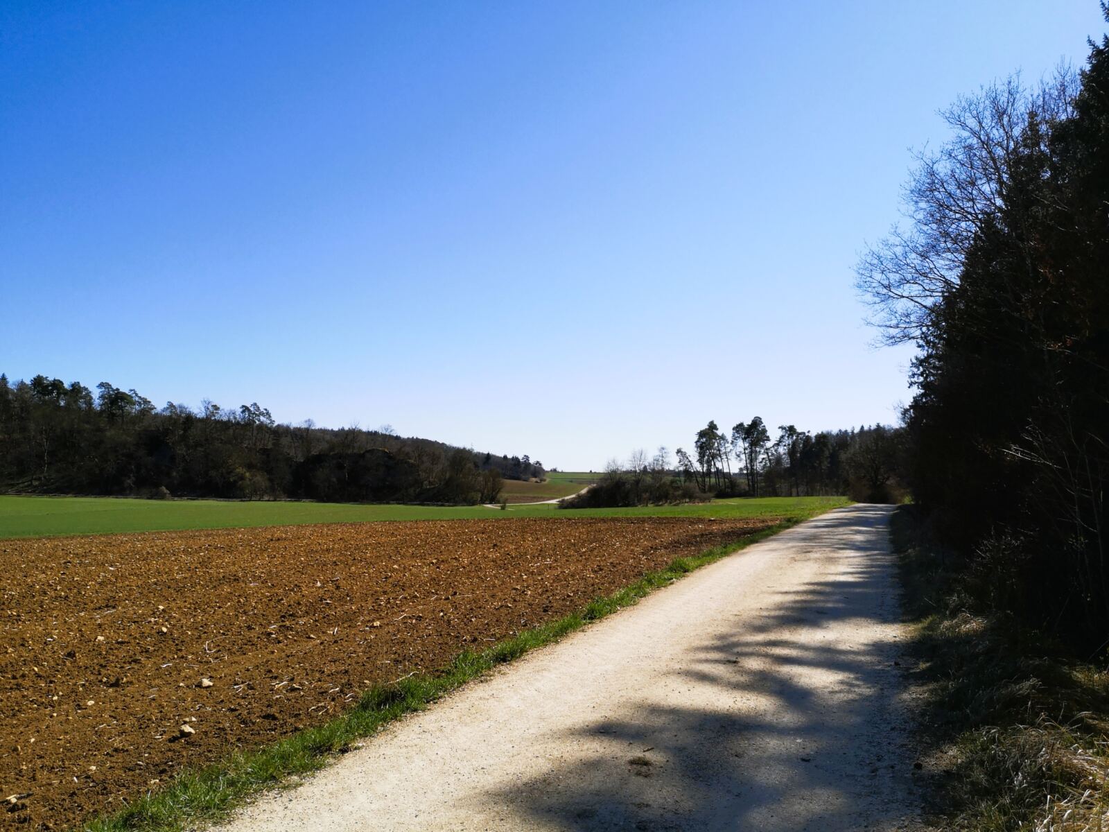 Nach dem Aufstieg halten wir uns links und erreichen schließlich Felder, dahinter ein paar Häuser – der äußere Rand von Börslingen. Am Waldrand entlang laufen wir auf einen Schweinemastbetrieb zu. Dahinter biegt der Wanderweg bald links ab. Über tatsächlich Stock und Steine, alle mit dichten Mooskissen bedeckt, steigen wir bergab. Unser Pfad trifft auf einen Forstweg. Wir halten uns hier rechts – und folgen bald dem Wanderweg rechts ab durch den Wald.