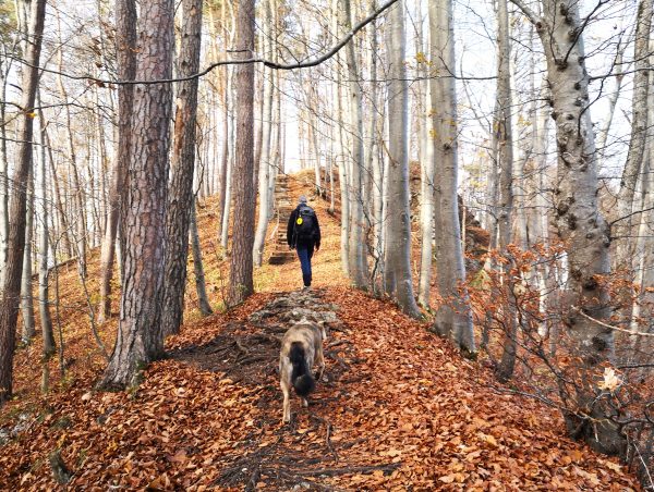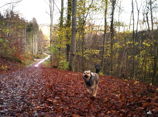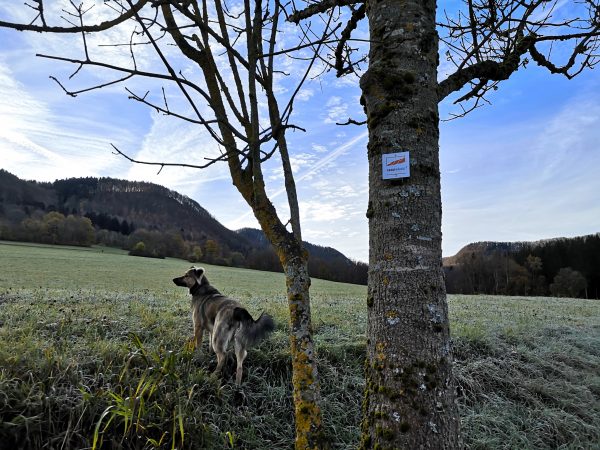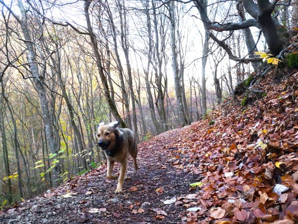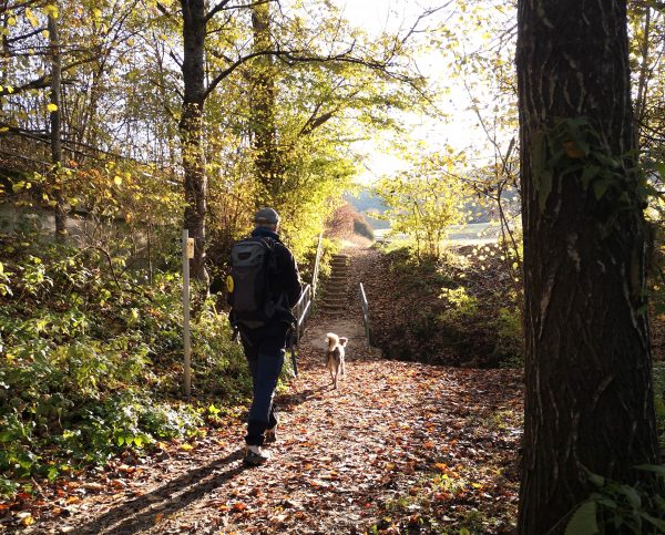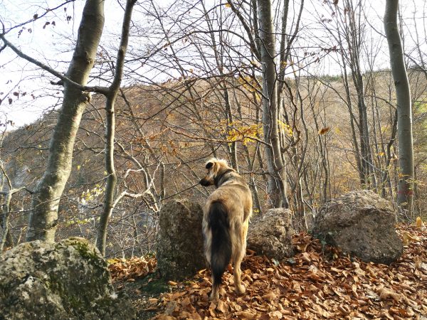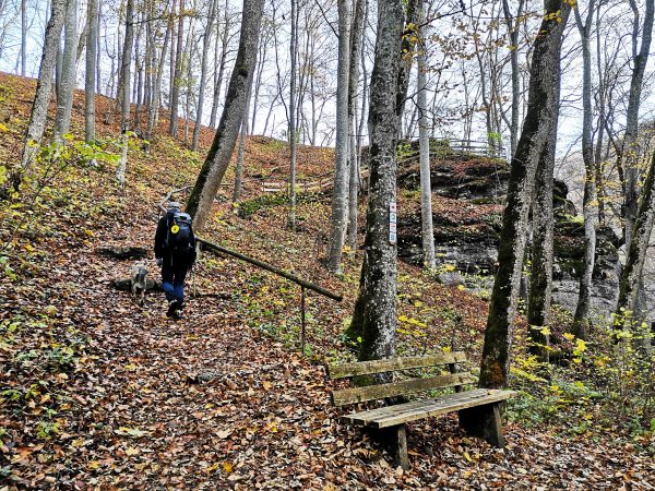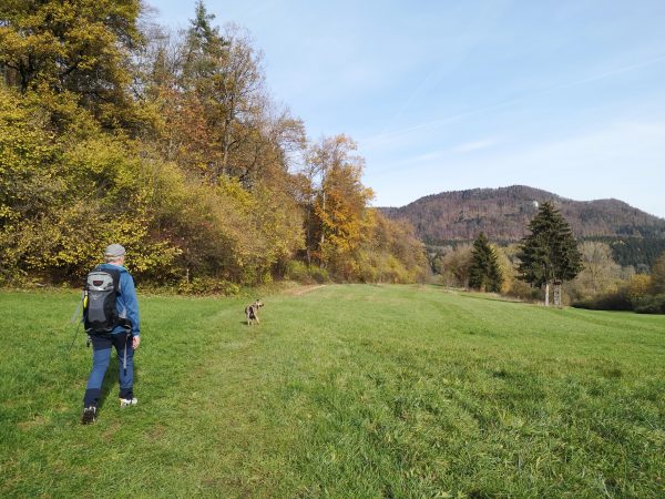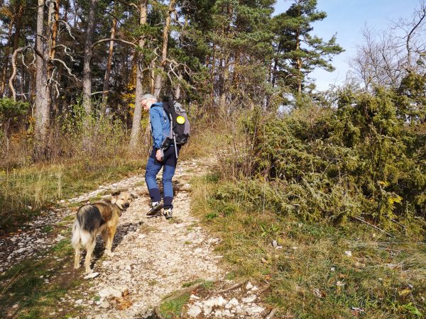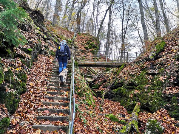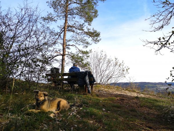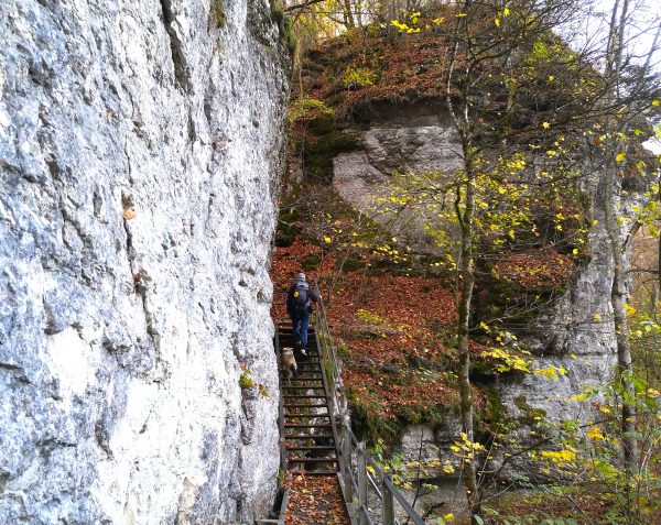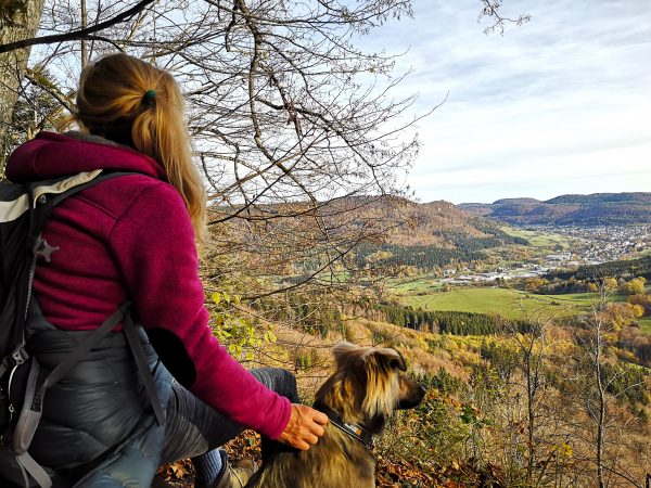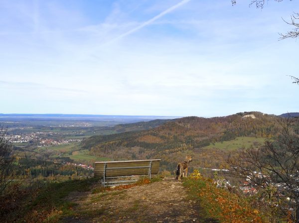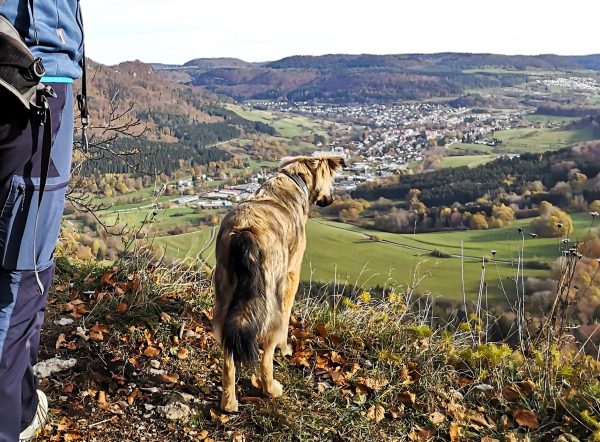Weitblicke, Wasser, Wald und imposante Jurafelsen – diese durchweg gut ausgeschilderte Runde am Albtrauf bietet so ziemlich alles, was Mensch und Hund gefällt. Auch der Höhepunkt der Tour, die „Hossinger Leiter“ lässt sich gut mit Vierbeiner überwinden. Denn es sind keine Sprossen, sondern Stufen aus Stein und Eisen, die sich an die weiße und verwitterte Felswand schmiegen. Der Weg führt auch über zwei kurze Gitterbrücken, eine davon kann der Wauzi jedoch umgehen. Noch vor gut 100 Jahren war die Hossinger Leiter für die Bewohner des Albdorfs Hossingen der einzige Weg, um aus ihrem Weiler heraus und nach Albstadt-Lautlingen zur Arbeit und zur Bahn zu kommen. Heute bietet sie Wandervergnügen vor tollem Panorama. An schönen Wochenenden empfiehlt es sich, möglichst früh zu dieser Rundtour zu starten. Damit ihr auf den abschnittsweise sehr schmalen Pfaden keinen Menschen in die Quere kommt, die Angst vor Hunden haben. Wir sind entlang des Wegs nur einer Handvoll Wanderern begegnet. Am Start- und Zielort erwartet euch ein Restaurant im Alpenstil – mit großem, wunderschön angelegten Biergarten, freundlicher Bedienung und sehr leckerer Küche. Unser Amos hat seine Portion Spätzle mit Soß sehr genossen. Krönendes Ende einer superschönen Tour.
