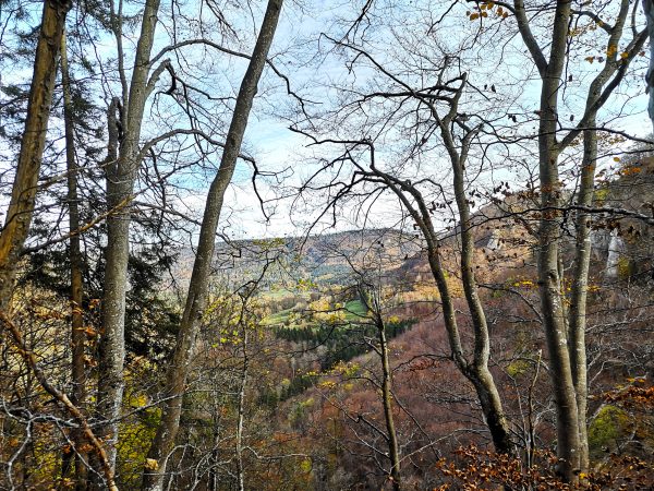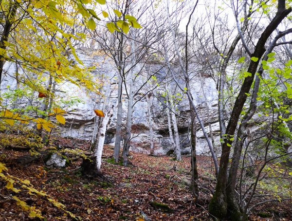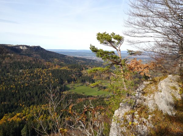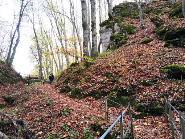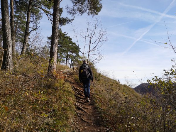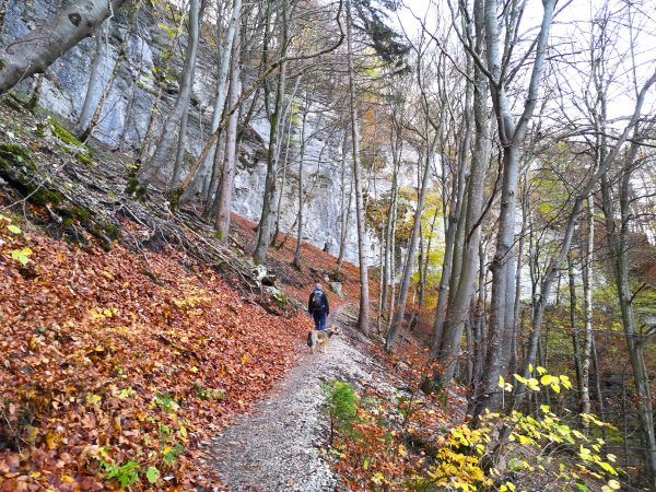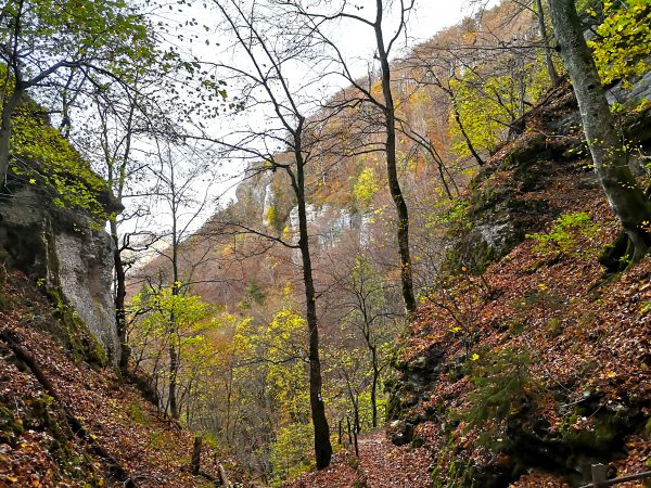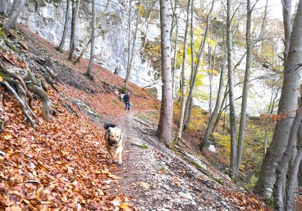 Verwitterte Jurafelsen, ein schmaler Steig, die Reste von buntem Herbstlaub. Hier sind wir auf dem vielleicht schönsten Abschnitt der Rundtour unterwegs, nur wenige Schritte später beginnt die "Hossinger Leiter", die sich an dieser Felswand entlangzieht.