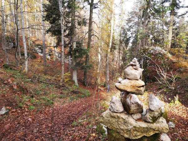 Steil bergab durch den Wald, vorbei an einem kleinen Felsenmeer.