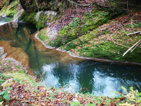 Nach dem Kassenhäuschen (1,50 Euro für Erwachsene) geht es steil bergab, durch den Nieselregen ist der Abstieg stellenweise rutschig. Dann erreichen wir das Flüsschen Obere Argen und folgen ihr ab jetzt, vorbei an Gumpen und Stromschnellen. Daneben erheben sich gewaltige Felswände. Regelmäßig informieren Schautafeln über die Geologie und die Tier- und Pflanzenarten, die hier zuhause sind. Wir sind beeindruckt von der Schönheit des Ortes und bedauern nur, keine Brotzeit eingepackt zu haben. Regelmäßig stehen Bänke und Picknicktische am Weg, die sich wunderbar für eine Pause anbieten würden.