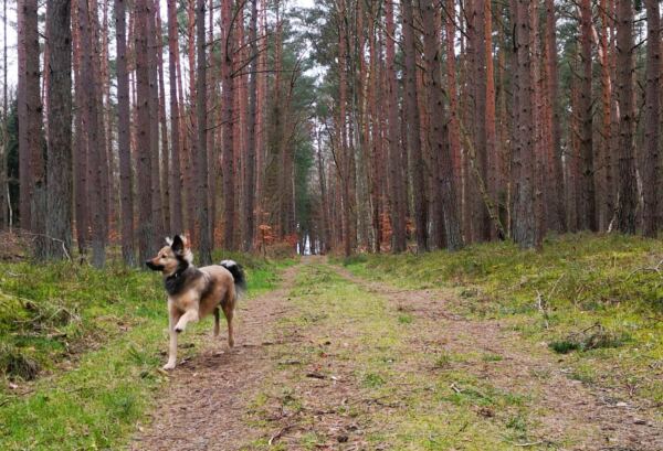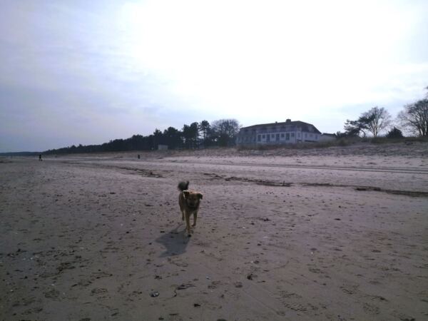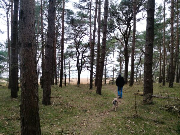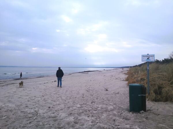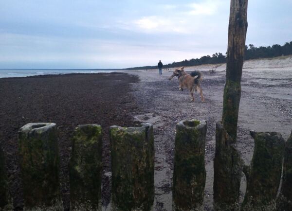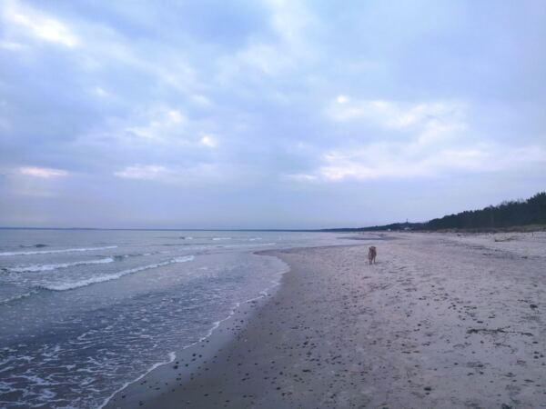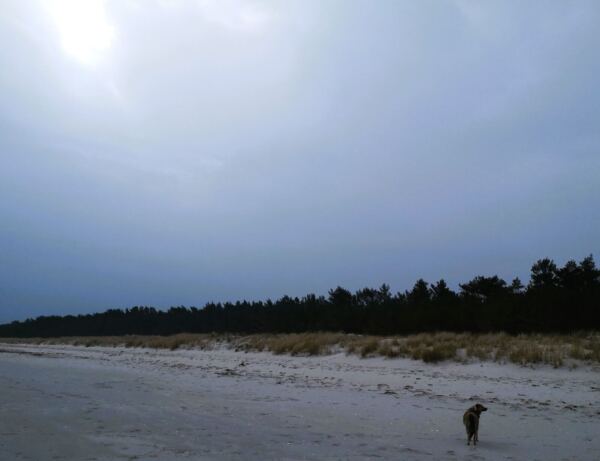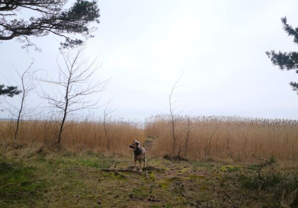 Schaabe – das klingt erst mal nicht sehr verlockend. Tatsächlich verbirgt sich hinter diesem Namen Rügens längster Sandstrand. Der 11 km lange und oft kaum mehr als 600 m breite Streifen Land verbindet die Halbinseln Wittow und Jasmund im Norden Rügens. Zu einer Seite der Schaabe liegt die offene Ostsee mit dem breiten Strand, zur anderen Seite der schilfbestandene Bodden, dazwischen ein lichter Wald. An beiden Enden der Schaabe finden sich jeweils Badeorte, die Nehrung selbst ist bis auf die Försterei unbebaut. Nur eine Straße führt hindurch. Alles in allem also ideal für eine Tour mit Hund, die Strand, Wald und Schilf bietet und auch noch Einkehrmöglichkeiten. Wer wie wir zwischen Herbst und Frühling kommt, kann seinen Vierbeiner auch außerhalb der ausgewiesenen Hundestrände freilaufen lassen, ohne dass es jemand stört (solange der Hund nicht die Strandspaziergänger ohne Hund belästigt, natürlich 😊).