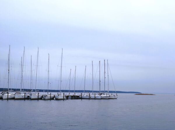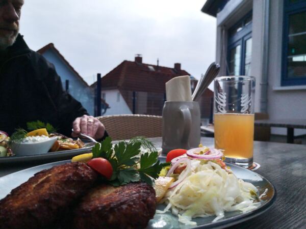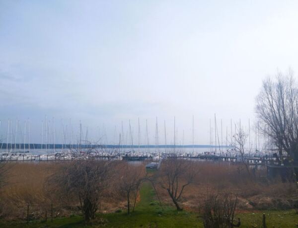 Durch hügeligen Strandwald spazieren wir vor zur schmalen Straße, die nach beiden Seiten gut einsehbar ist. Auf der anderen Seite halten wir uns weiter geradeaus Richtung Bodden. Wo Fußwege oder der Forstweg abzweigen, wählen wir immer den Weg, der uns weg von der Straße Richtung Westen zum Bodden führt. Kurz vor dem von Schilf gesäumten Ufer stoßen wir auf den markierten Wanderweg. Hier biegen wir rechts ab in die Richtung, aus der wir anfangs gekommen sind. Zwischen Wald und Boddenufer laufen wir immer geradeaus auf sandweichen Wegen, die unseren Amos zu vielen ausgelassenen Bocksprüngen animieren. Vorbei an einem Campingplatz im Wald erreichen wir bald die ersten Häuser von Breege, eine Ferienhaussiedlung mit Reetdächern. Rechts vorbei an der Siedlung stoßen wir auf die Wittower Straße. Wir biegen links ab und halten uns Richtung Zentrum, Amos nun an der Leine. Die Straße mündet in die Dorfstraße. Hier biegen wir wieder links ab und erreichen schließlich den kleinen Hafen von Breege. In der Saison starten von hier aus Ausflugsschiffe und die Fähre, die Feriengäste auf die autofreie Insel Hiddensee bringt. Außerhalb der Saison geht`s hier ruhig zu, die meisten Cafés und Läden haben geschlossen. Wir finden einen tollen Platz in der zweiten Reihe auf der Sonnenterrasse des Bistros „Zur kleinen Hafenräucherei“ mit superguten Fischfrikadellen und schönem Blick über den Bodden.