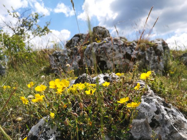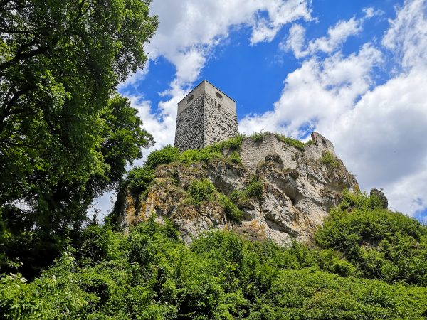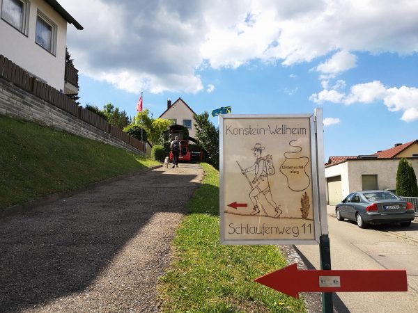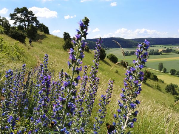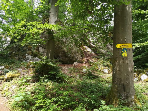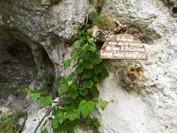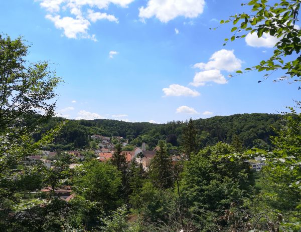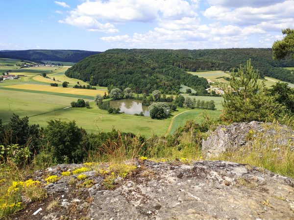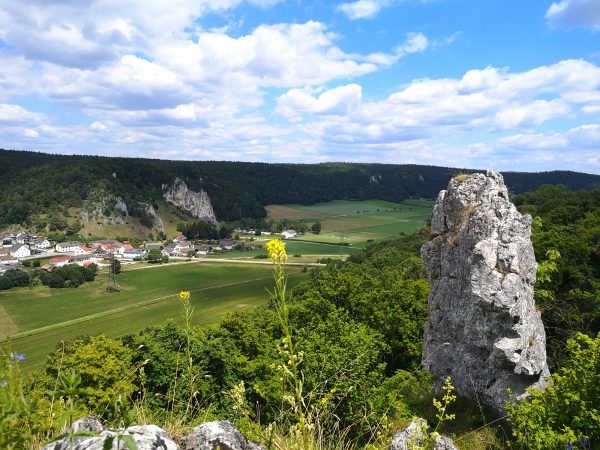 Startpunkt ist der Parkplatz am Bahnhof von Dollnstein – weil sich dort auch ein Wohnmobil abstellen lässt. Vor der Bahnunterführung finden wir unseren Wegweiser, dem wir fortan folgen werden: Schlaufe 11. Für die unseres Erachtens schönere Laufrichtung solltet ihr an der Antoniuskapelle rechts abbiegen. Nach wenigen Metern zwischen Häusern auf der Straße „Am Gänsbuck“ hinauf erreicht ihr schon die Wacholderheide über Dollnstein und seid in einer ganz anderen Welt. Felsen, Wildblumen, Tiefblick. Ein Traum! An der oberen Hangkante wandern wir immer geradeaus. Schließlich geht`s den Berg hinab, zwischen Feldern und durch Wald nach Konstein. Vorbei am Marktplatz mit Brunnen laufen wir über die Bahnhofstraße bis zur Kreuzung an der Staatstraße und biegen links in die Glashüttenstraße ein. Nach ca. 100 m führt uns der Wanderweg hinauf zum Aussichtspunkt „Löwenkopf“. Unbedingt diesen kleinen Abstecher den Fels hinauf mitnehmen! Toller Ausblick ins Urdonautal.