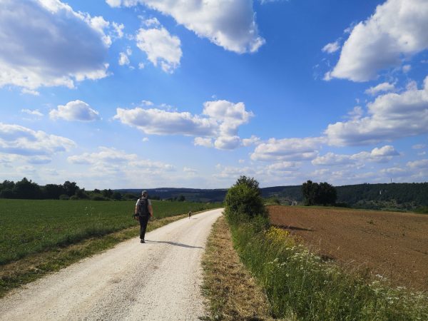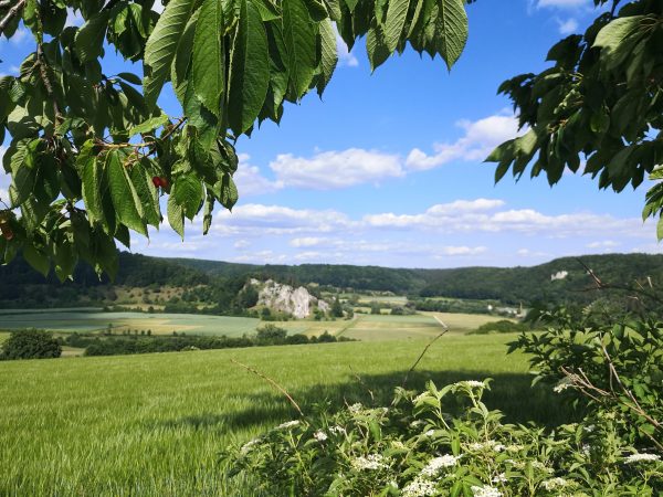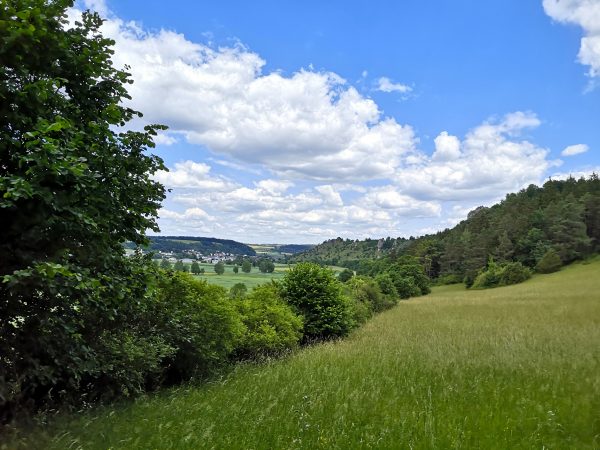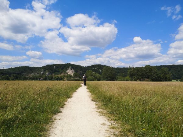Die Rundtour verläuft überwiegend auf schmalen Wiesen- und Waldpfaden. Die letzten gut drei Kilometer legen wir auf Forstwegen zurück. Die Runde wartet nur mit einem knackig-kurzen Anstieg hinter Aicha auf, sonst sanftes Auf und Ab. Unterwegs kommen wir zwar immer wieder an Wasser vorbei, Flüsse, Bäche, Brunnen und die Schutterquelle. An warmen Tagen reicht das vielen Hunden aber wohl nicht zum Auftanken. Also Extraliter mitnehmen. Sonne und Schatten wechseln sich ab. Die Stationen der Tour: Dollnstein – Konstein – Wellheim – Aicha – Dollnstein.
