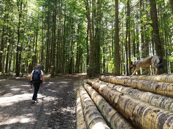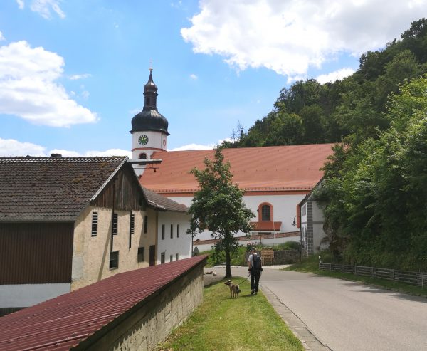 Durch den Wald geht`s weiter über die Fahrstraße zur Burgruine und weiter bergab über einen Steig zur Gammersfelder Straße nach Wellheim. Mit unserem Amos, nun an der Leine, laufen wir vorbei an Pfarrkirche und Marktplatz, weiter über die Schutterbrücke Richtung Harder Straße. Diese verlassen wir nach 200 m und biegen links in die Wittmeßstraße ein. Kurz vor der Schule zweigen wir links in den Hüttenweg ab. An seinem Ende darf Amos wieder frei laufen. Erneut geht es über die Schutter, dann rechts ab. Wir halten uns Richtung Pappelallee, biegen davor links ab und erreichen die Schutterquelle. Hier trifft Amos dann auf den ersehnten Spielgefährten. Im benachbarten Ingolstädter Naturfreundehaus hält er unter der Bank ein Schläfchen, während wir die Zeit verplaudern. Geht hier wunderbar, und man kommt schnell mit den Umsitzenden ins Gespräch. Wir wandern schließlich geradeaus durch den Wald, dann bergab zwischen Feldern nach Aicha – Treffpunkt für Kletterer. Vorbei an der Gastwirtschaft „Klettergarten“ geht`s bald steil hinauf durch den Wald. Wir treffen auf die alte Römerstraße, die einst von Nassenfels nach Weißenburg führte. Jetzt lassen wir es einfach laufen. Immer geradeaus erreichen wir offenes Gelände. Zwischen Feldern geht`s weiter mit schönem Blick auf den Burgsteinfelsen und Dollnstein. Der Forstweg wird zur Teerstraße, die uns zur Antoniuskapelle bringt. Noch einmal durch Dollnstein, einmal in die Altmühl hüpfen (Amos) und zurück zum Ausgangspunkt.
