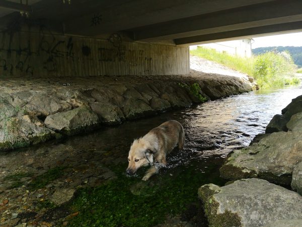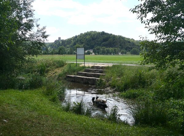 Amos Höhepunkt der Tour: Toben und Planschen in der Schutterquelle mit einem wilden Spielgefährten.
