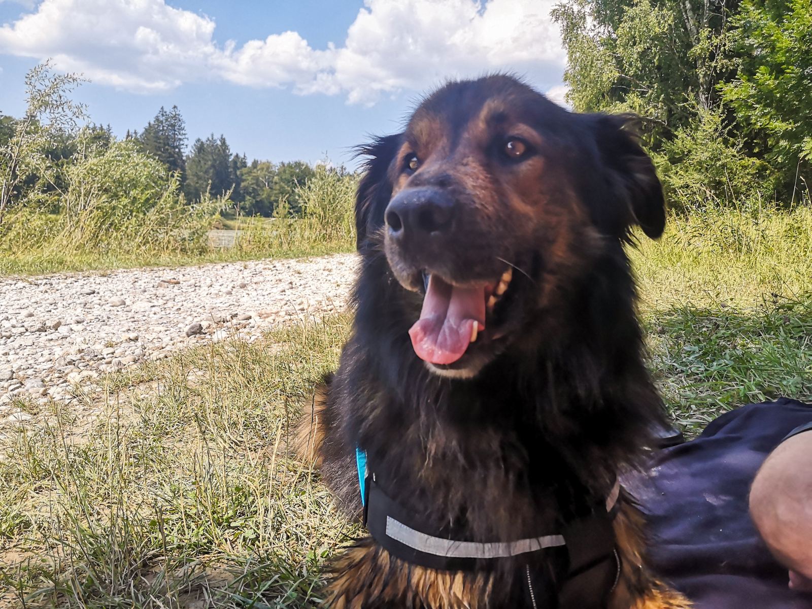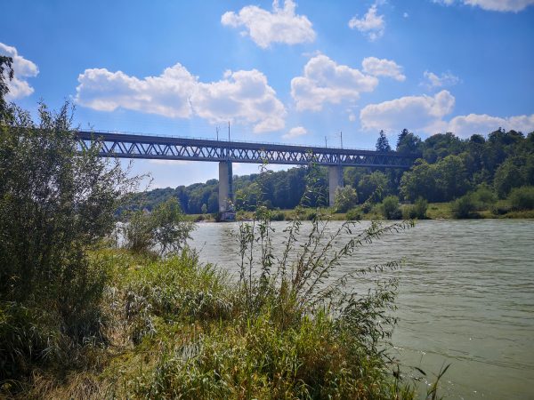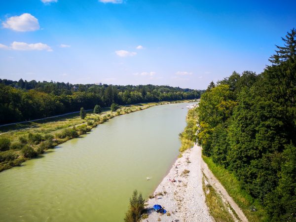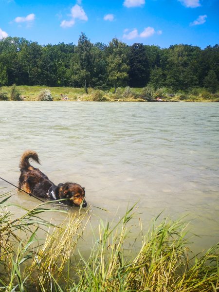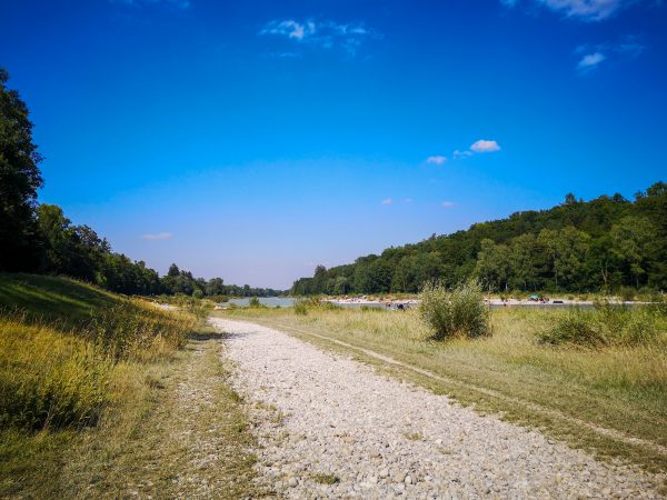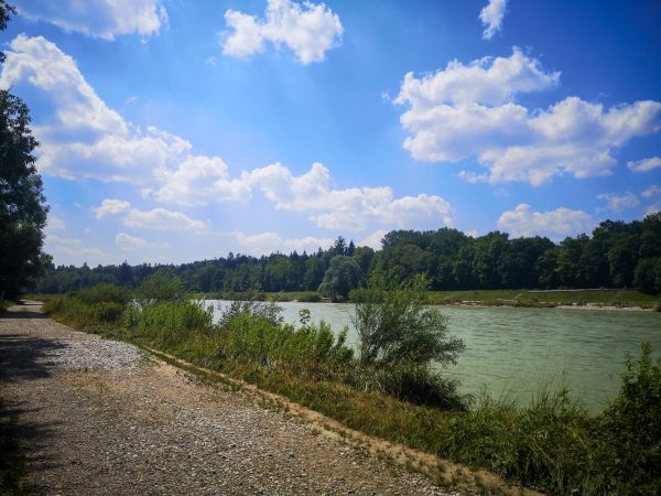 Wir starten an der U-Bahn-Station Thalkirchen. Von dort über die Brücke und nach rechts zum Isarufer und dann Richtung Süden. Hier hat man die Wahl zwischen einem groben Schotterweg direkt am Ufer und einem parallel laufenden Weg im Wald. Hier ist der Boden angenehmer und durch die Bäume ist es kühler. Man teilt sich den Weg mit vielen Radfahrern, er ist aber breit genug, um genug Platz für alle zu bieten. Immer wieder führen kleine Trampelpfade zum Ufer zurück, die wir für Abstecher ans und ins Wasser nutzen.