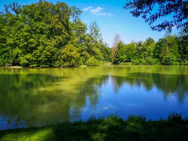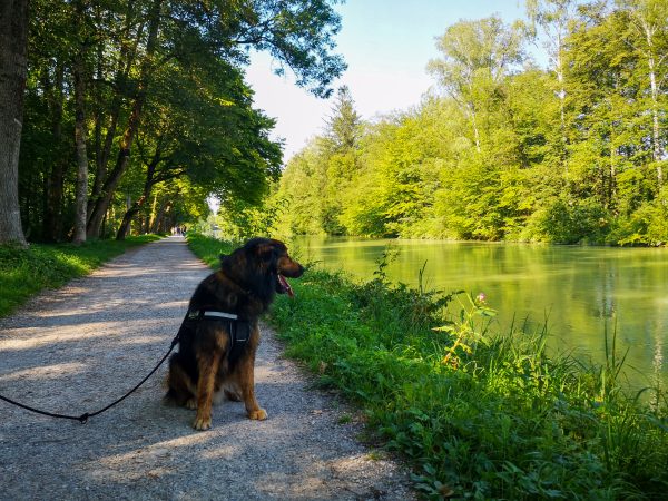 Nach der Einkehr machen wir uns an die zweite Hälfte der Tour: Am Hochufer zurück zur Großhesseloher Brücke und auf der anderen Isar-Seite nach unten. Über eine kleine Brücke wechseln wir auf die Insel und laufen am Isar-Ufer entlang weiter. Dann führt ein asphaltierter Weg in einem Linksbogen über den Isarwerkkanal – wir nehmen ihn und erreichen kurze Zeit später den Hinterbrühler See. Eine kleine Brücke führt zurück über den Kanal ans Ufer des Sees, dann geht es ein paar Stufen nach unten in die Grünanlage. Achtung: In dem kleinen Naturschutzgebiet rund um den idyllischen See gilt Leinenpflicht, unter anderem zum Schutz der vielen Wasservögel, die hier leben. Beim Betreten des Gebietes weisen Schilder darauf hin.