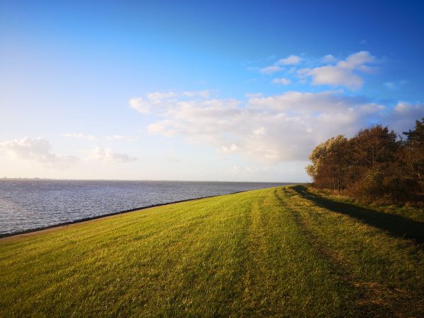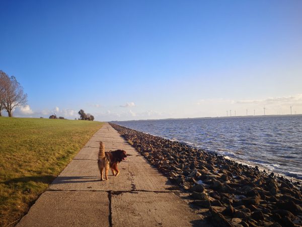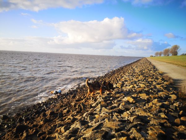 Ein wunderschöner Spaziergang zwischen Deich und Wasser. Unterwegs treffen wir regelmäßig Hunde, die meisten laufen frei.