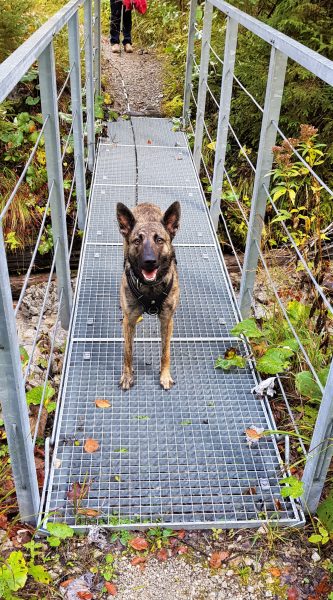 Etliche dieser Stahlbrücken liegen auf dem roten Weg am Wasser entlang. Für Cleo kein Problem, für andere Vierbeiner vielleicht schon.