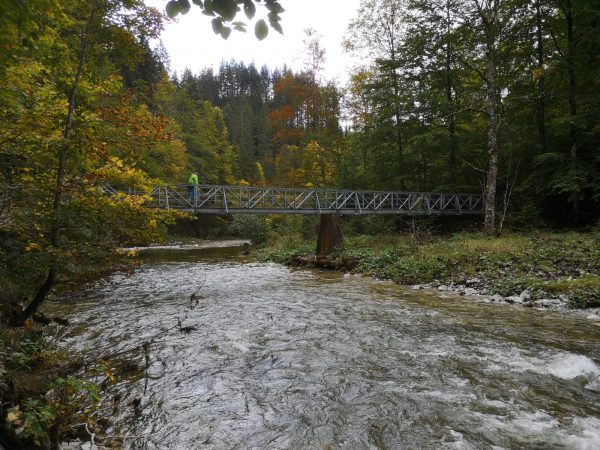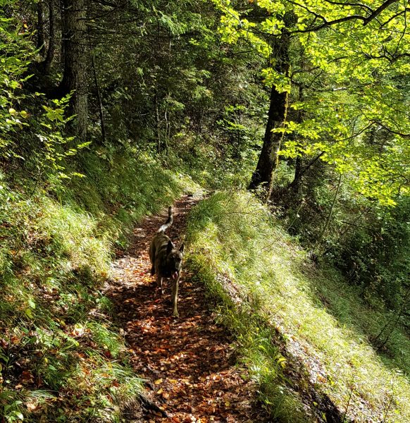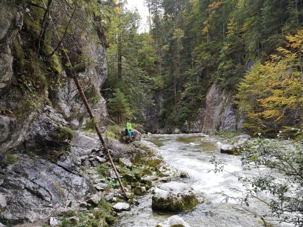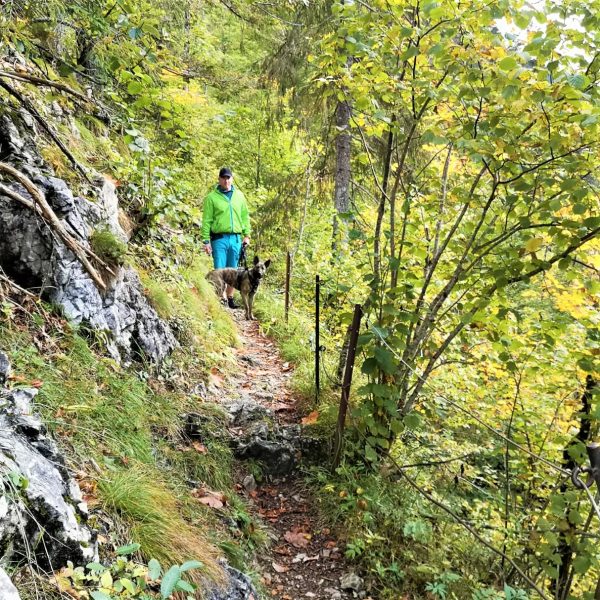 Um es gleich vorweg zu nehmen: Diese Tour verlangt streckenweise Trittsicherheit, ist nichts für Menschen mit großer Höhenangst und Hunde, die Gitterbrücken scheuen. Dafür bietet sie Wildwasser-Romantik und führt zurück in eine Zeit, in der Holz noch „getriftet“, also auf Flüssen transportiert wurde. Wunderschön im Frühsommer, wenn im Graben der Grundache viele Wildblumen, auch Orchideen blühen. Hin geht’s auf Schotter, zurück auf schmalen, passagenweise ausgesetzten Bergpfaden und über Brücken.