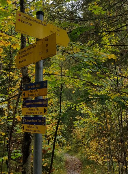 Der Schilderbaum kurz hinter der Ochsenalm mit dem deutlich kürzeren und schotterfreien, aber anspruchsvolleren Weg hinab in die Schlucht.