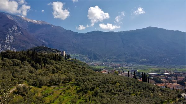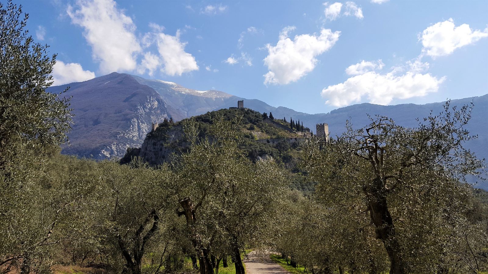 Grandiose Aussicht auf Arco, seine Burg und die Olivenhaine.