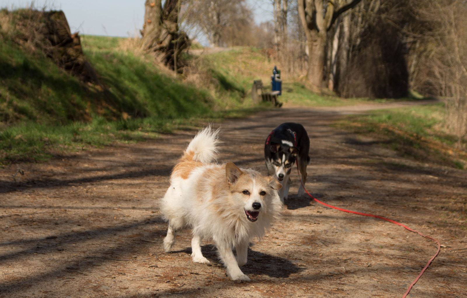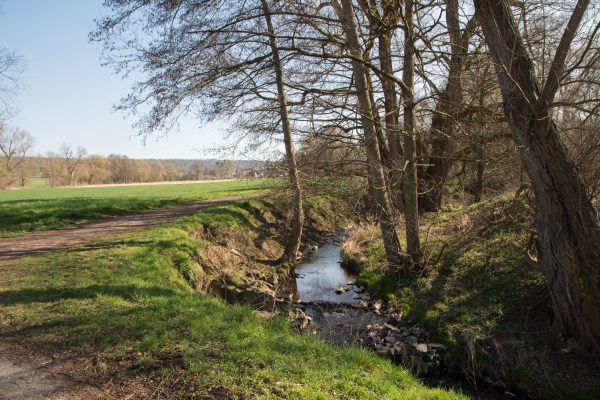 Die Tour beginnt am Parkplatz in Lohfelden. Von hier aus geht es an Wiesen und Feldern vorbei, dann treffen wir auf den ersten Wegweiser des Baddschensteigs. Nach zwei Straßenüberquerungen treffen wir auf den Wahlebach, die Hunde können sich hier kurz abkühlen.