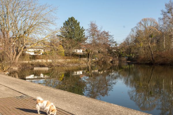 Wir folgen dem nächsten Gewässer: dem Mühlenbach, der den Hunden wieder Gelegenheit zum Abkühlen bietet.