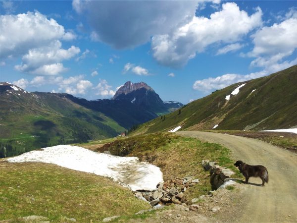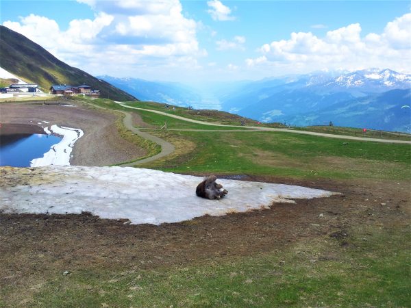 Wenn im Salzachtal die Temperaturen schon im Frühling in die Höhe klettern und gerade Winterfell-warme Hunde nach Frische lechzen, bringt ein Abstecher nach oben die ersehnte Abkühlung. Diese Tour startet  an der Talstation der Wildkogelbahn, die uns auf den gleichnamigen Berg auf gut 2.100 Meter Seehöhe hebt. Von hier aus reicht der Blick bei klarem Wetter weit über die Gipfel der Hohen Tauern. Der Wildkogel bietet eine Vielzahl von Wanderwegen in allen Schwierigkeitsgraden und ist touristisch stark erschlossen. Alleine ist man hier also nie. Sei’s drum. Schönheit teilt man ja gerne. Unsere kleine Wanderung führt – vorbei an letzten Schneeresten zum genüsslichen Wälzen – zum gemütlichen und hundefreundlichen Almrestaurant Geisl Hochalm mit Supersicht auf den Großen Rettenstein, den markantesten Gipfel der Kitzbüheler Alpen. Auch für zwei- und vierbeinige Flachlandtiroler kein Problem. Besonders schön im Frühling.