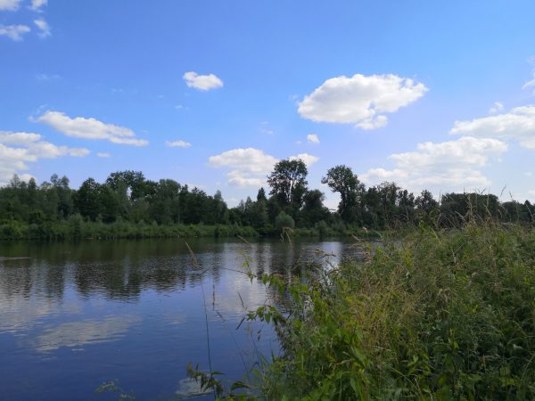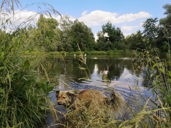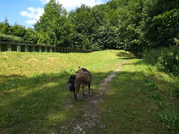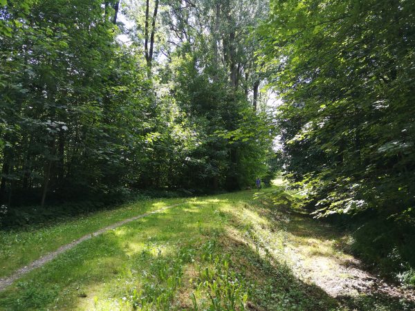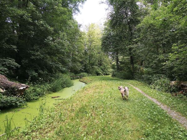 Am linken Wertach-Ufer nahe der Schafweidensiedlung liegt das „Wäldle am Köpfle“, der kleinere Teil des Gögginger Stadtwalds. Auf den schmalen Pfaden durchs Wäldchen sind wir selbst an sonnigen Wochenenden fast alleine unterwegs. Und die Radler kommen uns hier auch nicht in die Quere. Schön für alle, die mit Hund (mal) Ruhe suchen.