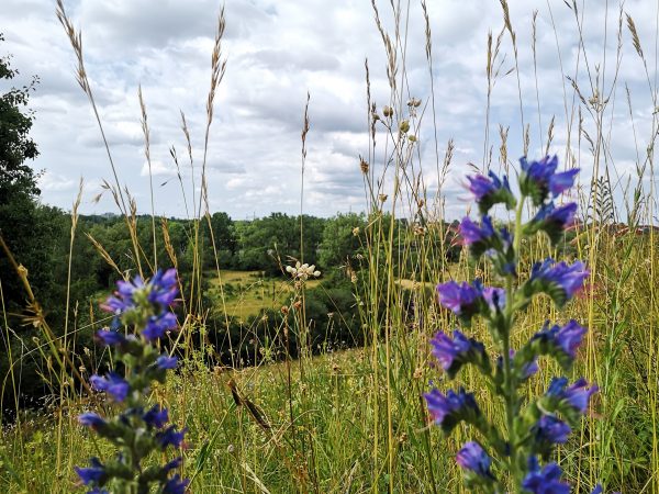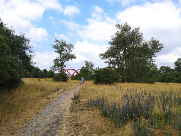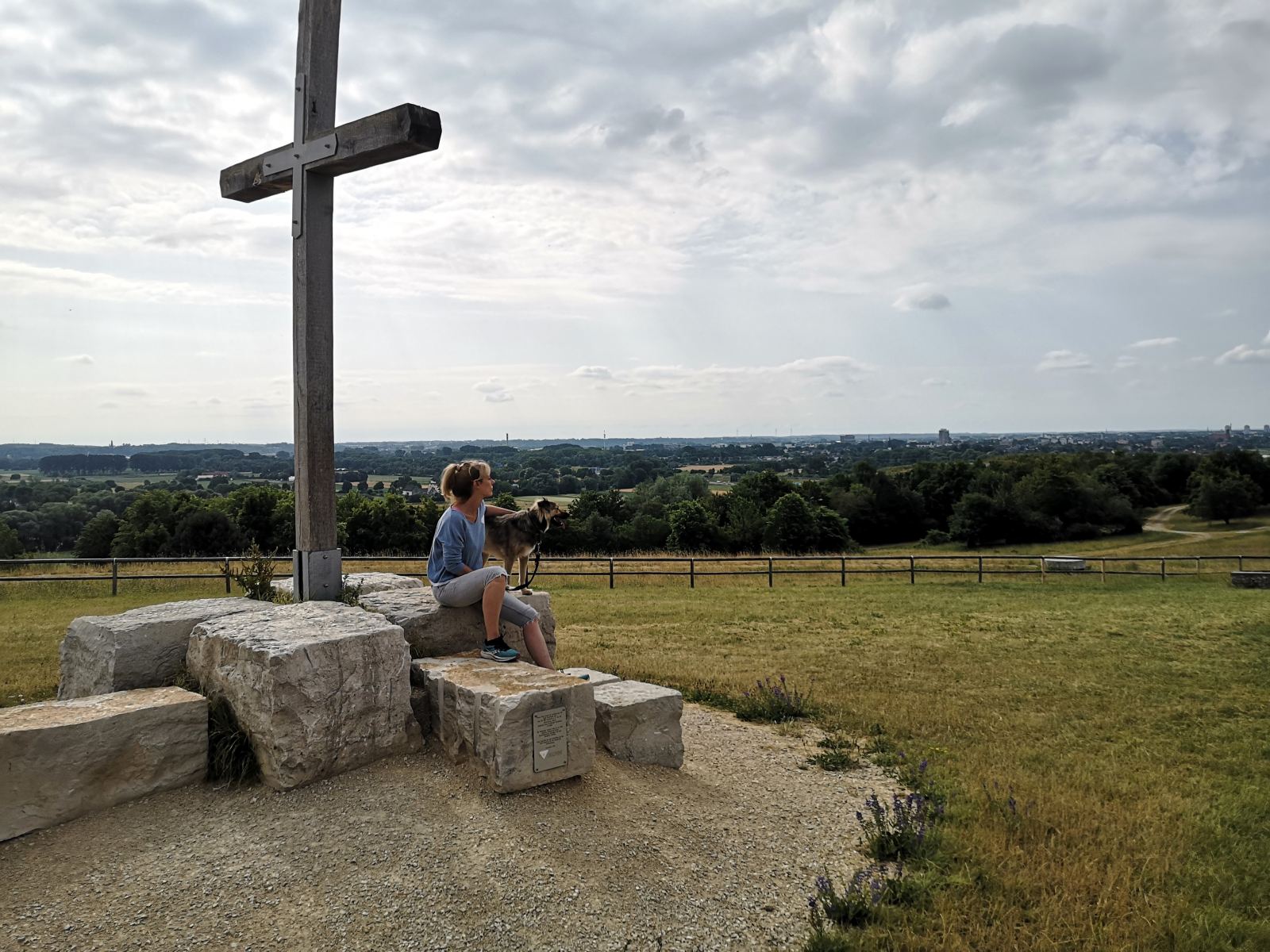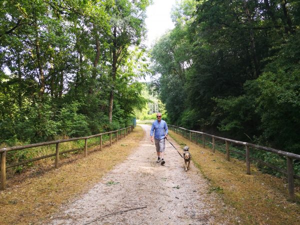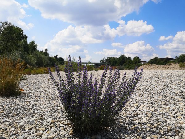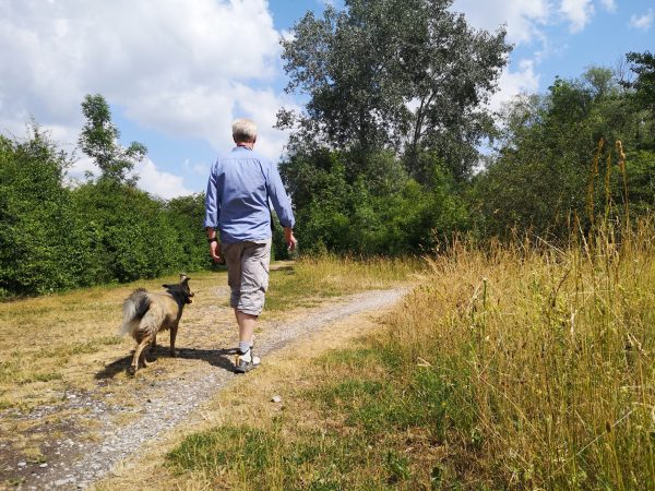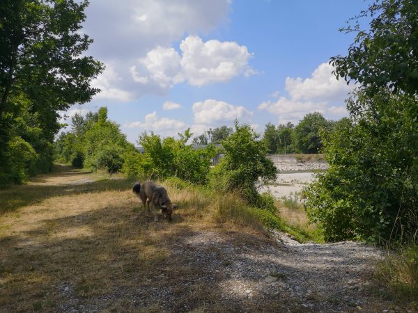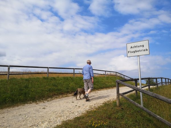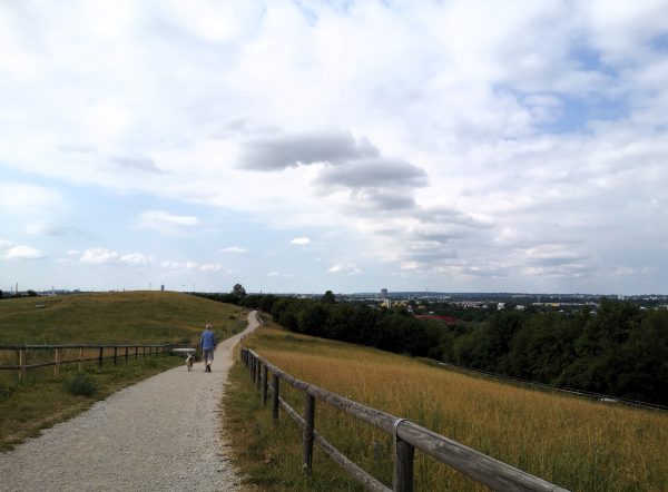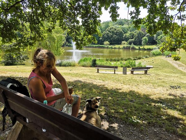 Wir starten am Parkplatz an Europawiese und Europaweiher. So benannt, weil das Gelände früher als Festwiese genutzt wurde und die Gersthofer hier mit ihrer französischen Partnerstadt etliche Partys feierten. Auf dem gesamten Areal gilt Leinenpflicht. Wir laufen vorbei am Europaweiher mit seiner Fontäne und weiter durch das Drehkreuz der Deponie, das von November bis März von 8 bis 16 Uhr und von April bis Oktober von 8 bis 20 Uhr geöffnet ist. Es gibt nur wenige Wege, die für die Öffentlichkeit frei zugänglich sind. Eine entsprechende Karte informiert am Eingang zum Schuttberg, der in Teilen immer noch als Deponie genutzt wird. Auch hier gilt Leinenpflicht, eine Schleppleine tut es aber völlig. Die haben wir leider nicht dabei. Wir laufen hinauf zum Gipfel, genießen den Blick, und wieder hinunter Richtung Firnhaberauheide. Hinter der Brücke und einem weiteren Drehkreuz biegen wir rechts ab und laufen – unser Hund noch immer an der Leine – durch die Heidelandschaft, der pinke Grasnelken und andere Blumen schöne Farbtupfer aufsetzen. Am Ausgang der Heide biegen wir rechts ab. Unter der Autobahnbrücke hüpft unser Amos, jetzt leinenfrei, erst mal in den Lech. Weiter geht`s am breiten Wanderweg leinenfrei zu den Kiesbänken vor und hinter dem Lechwehr. Badepausen inklusive. Für das abschließende Picknick nach der Tour wählen wir eine Bank am Europaweiher. Auch wenn der Wauzi hier nicht im See abtauchen darf, ist der Ort superschön.