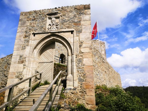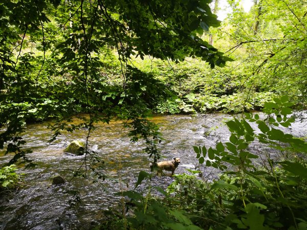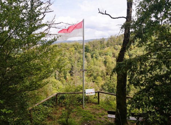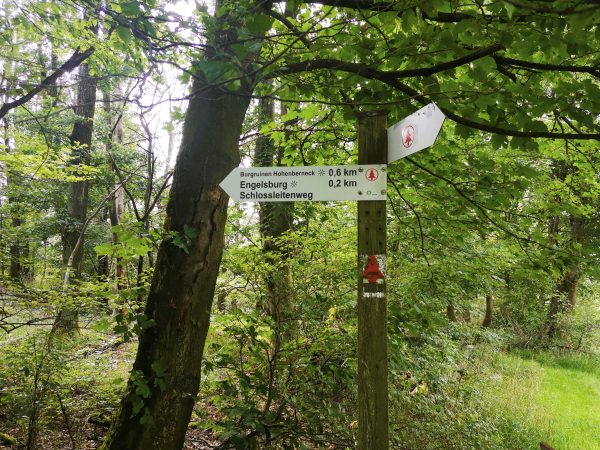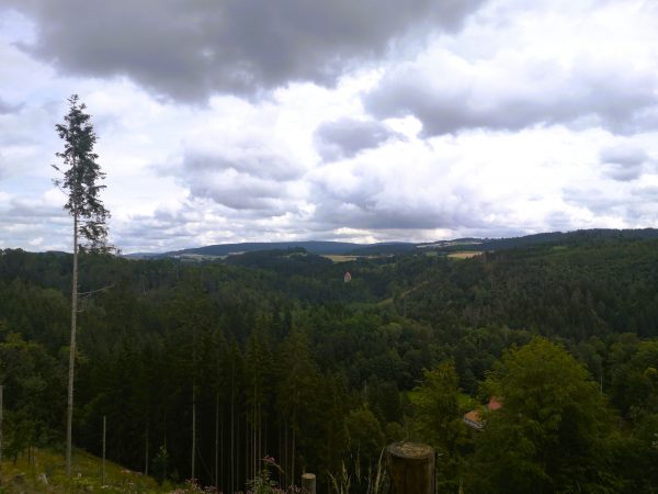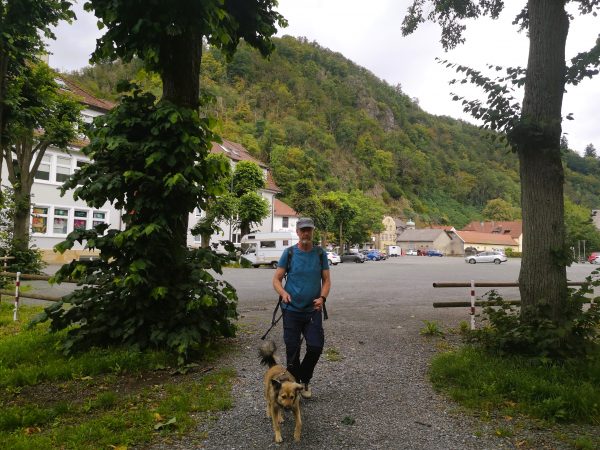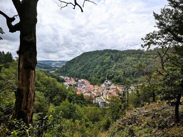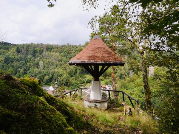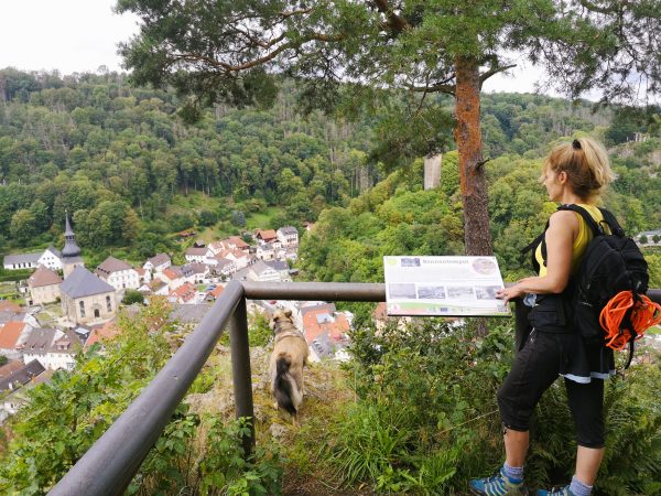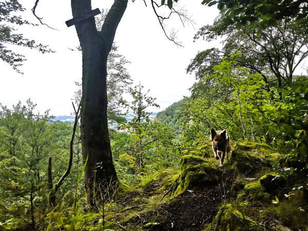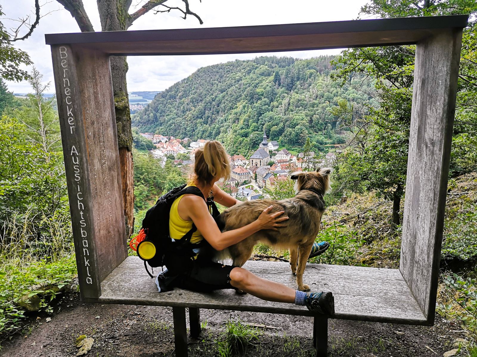 Auf einem schmalen Pfad geht es weiter bergauf durch den Wald zum ersten Aussichtspunkt, dem Freiheitsfelsen. Danach geht`s in schneller Folge weiter mit den tollen Panoramablicken. Auf den „Sonnentempel“ folgt die „Schöne Aussicht“, den Niehrenheimfelsen und weiter zum Ludwigsfelsen. Durch wunderschönen Mischwald geht es hinab ins Ölschnitztal. Unser Amos legt eine Planschpause ein, danach laufen wir weiter am Fluss entlang. Wir queren die Ölschnitz, halten uns rechts und folgen dem Forstpfad den Berg hinauf. Bald führt uns der Weg links ab, durch Wald und an Feldern entlang. Wir biegen links ab und erreichen den Aussichtspunkt Engelsburg.