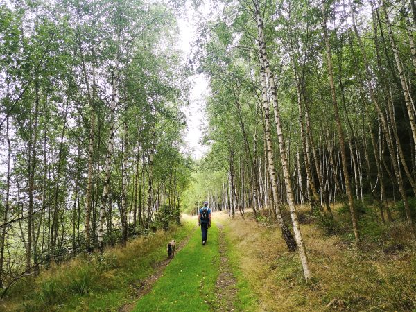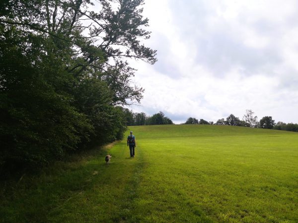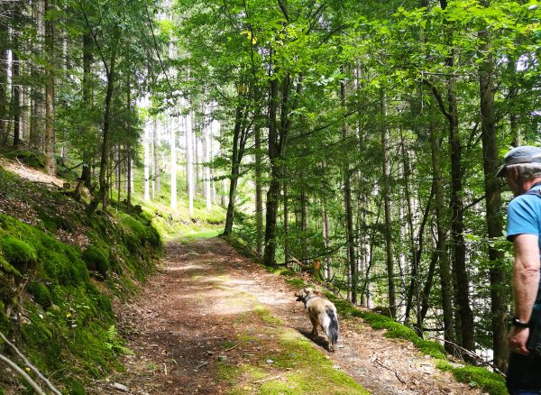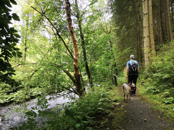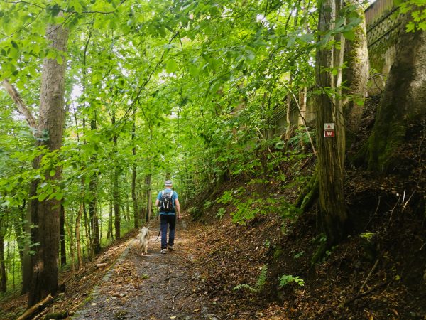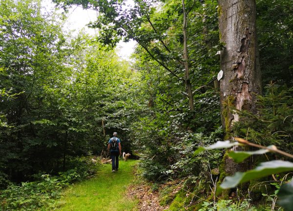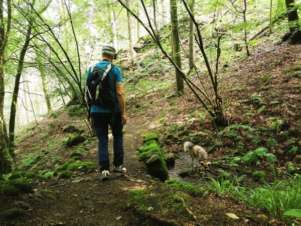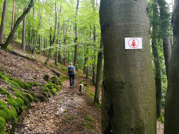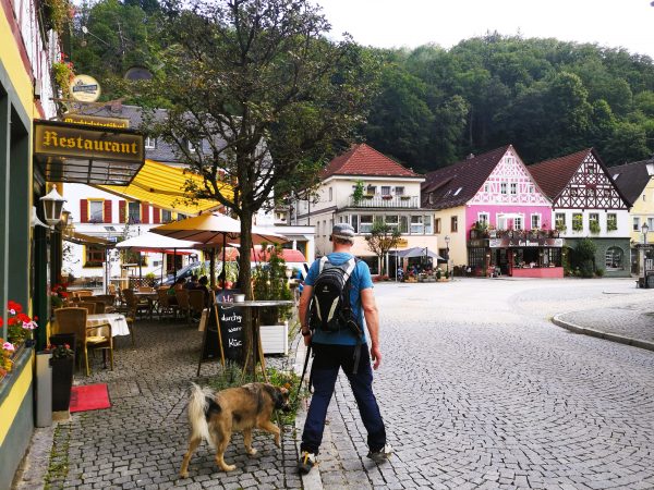 Würden die Brüder Grimm den Schauplatz eines Märchens suchen, Bad Berneck im Fichtelgebirge hätte gute Chancen, das Rennen zu machen. Der Luftkurort liegt umgeben von 7 Bergen und wird von 7 Flüssen durchzogen. Ziemlich märchenhaft ist auch der bekannte Wanderweg, der uns über die Berge von Bad Berneck führt: der Thiesenring. Entlang des Panoramawegs liegen zahlreiche Aussichtspunkte, Reste von Burgen, ein uraltes Bergwerk und auch der Kurpark von Bad Berneck mit seiner alten Wandelhalle. In Teilen sind wir auf alten Handelsstraßen unterwegs. Es geht bergauf und bergab, mal durch den Wald, mal über Lichtungen, vorbei an Feldern und entlang von Flussläufen, in denen sich unser Hund erfrischen kann. Unter Füßen und Pfoten: überwiegend weiche Waldpfade, kurze Strecken über befestigte Forstwege. Mehr Waldschatten als Sonne. Eine wunderbar abwechslungsreiche Tour mit Hund, die durchgehend gut beschildert ist. Wir folgen immer der roten Tanne auf weißem Grund.