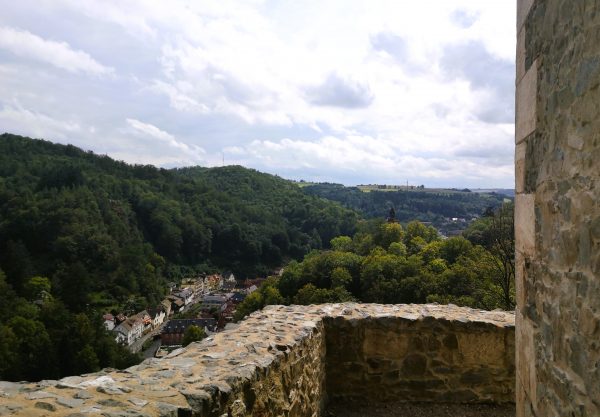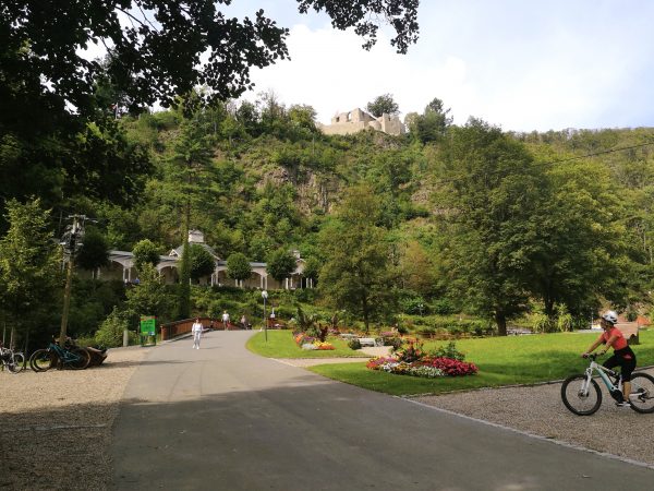 Nach einem Abstecher in der Ruine von Burg Hohenberneck steigen wir ab ins Städtchen für einen kurzen Bummel und eine Tasse Kaffee. Den Bogen durch den Kurpark streichen wir, den im Park sind Hunde verboten. Durch die Stadt laufen wir zurück zum Ausganspunkt – weil es ganz einfach zu heiß ist, um wieder bergan auf den Rundweg zu steigen. Der hätte nach der Ruine weiter geführt über den letzten der 7 Berge, die Hohe Warte mit dem Aussichtspunkt Rotherfelsen.