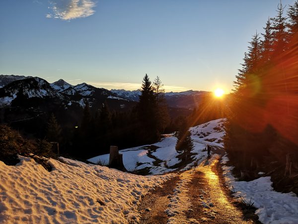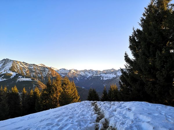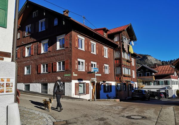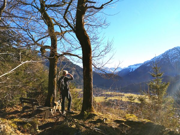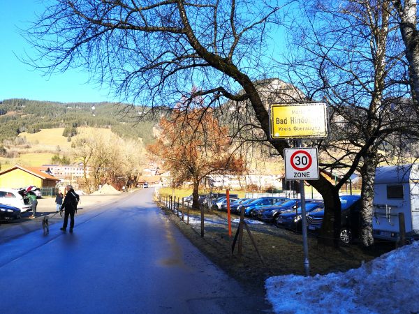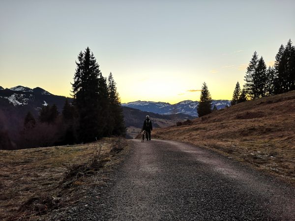 Ausgangspunkt unserer Tour ist der Parkplatz am Sportplatz (Alpgasse, 87541 Bad Hindelang), direkt am Hirschbach und gegenüber der Hornbahn. Hier kann man auch mit Wohnmobil parken. Von hier aus geht`s in den Ort und hinauf, den Wegweisern Gailenberg folgend. Nach den letzten Häusern an einer kleinen Hütte biegen wir rechts ab. Der Hirschberg ist hier schon ausgeschildert. Am Zillenbach geht`s weiter hinauf. Wenig später biegen wir nach rechts ab und queren den Zillenbach über die Gitterbrücke. Wir folgen dem schmalen Pfad durch lichten Wald, vorbei an schönen Felsformationen. Er mündet auf einen breiteren Forstweg. Gegenüber der Bank mit schönstem Ausblick über den Ort zweigt der Bergpfad ab, der uns recht steil in vielen Kehren mal durch Wald, mal durch offenes Gelände an der Bergflanke weiter und weiter nach oben zum Gipfelkreuz bringt. Nach einer ausgiebigen Brotzeitpause laufen wir weiter hinauf zum eigentlichen Gipfel, den Wegweisern zur bewirtschaftenen Klankhütte folgend. Über Wiesen geht es hinab zur Klankhütte, wo der Pfad auf die befestigte Zufahrtsstraße führt. An der Kapelle zweigt links wieder der schmale Wanderweg hinab nach Bad Hindelang ab. Wegen des hohen Schnees und den schnell schwindenden Lichts bleiben wir auf der Zufahrt. Unser Amos kann sich auch hier noch wunderbar austoben. Nur noch einmal biegen von der Straße ab und wandern über einen schmalen Wiesenpfad zum Aussichtspunkt Imne mit Kreuz und Bänken. Von hier aus geht es recht direkt und steil über Wiesen bergab, bis wir wieder auf die Gailenbergstraße stoßen, die wir bereits vom Hinweg kennen. Ab hier Hinweg wie Rückweg.