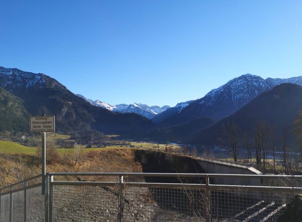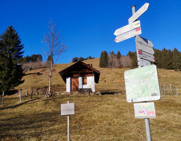 Letzter Abstecher von der Zufahrt: der Aussichtspunkt Imne auf einer Weide über Bad Hindelang.