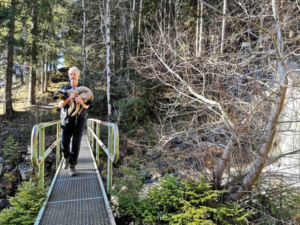 Auf der Gitterbrücke über den Zillenbach lässt sich Amos tragen.
