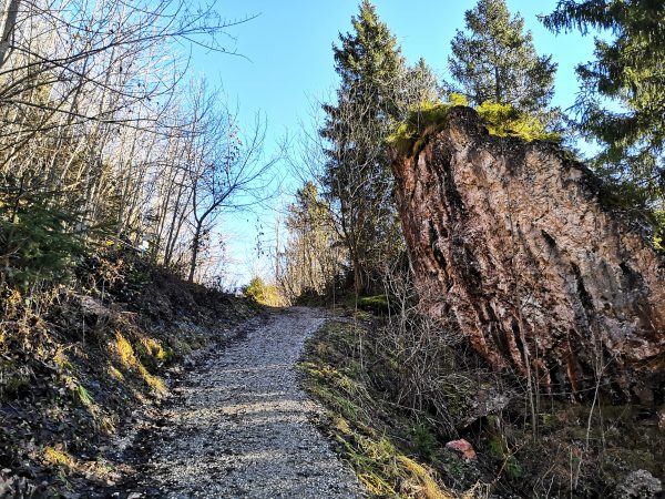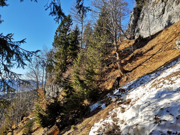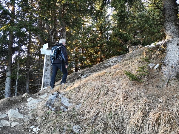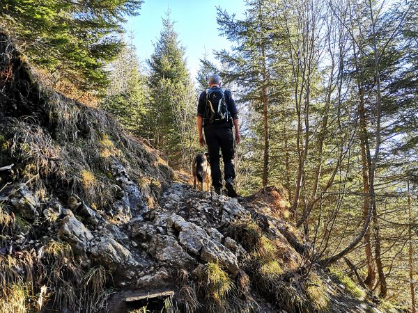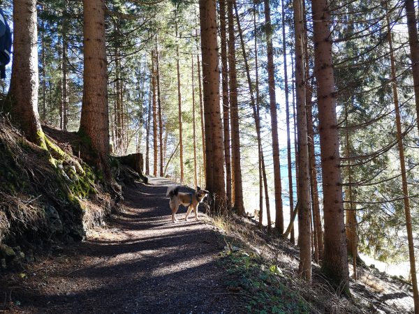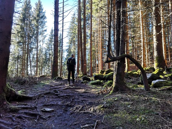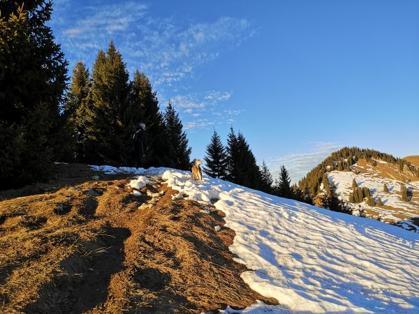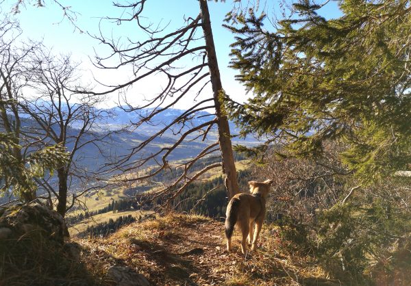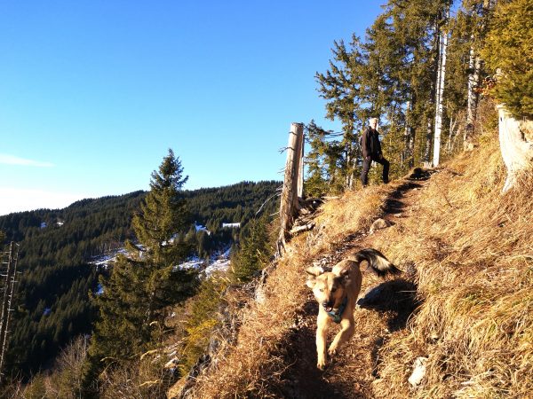 Hinauf steigen wir an der Südwestflanke des Bergs, Sonne und Baumschatten wechseln sich ab. Hinab geht`s an der Nordseite, mal zwischen Bäumen, mal zwischen Kuhweiden. Selbst im Winter kann`s Hund und Mensch recht warm werden. Also Wasser für beide mitnehmen.