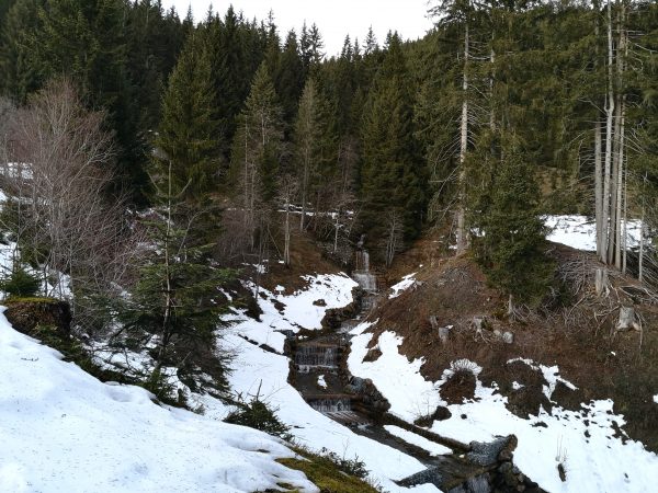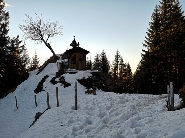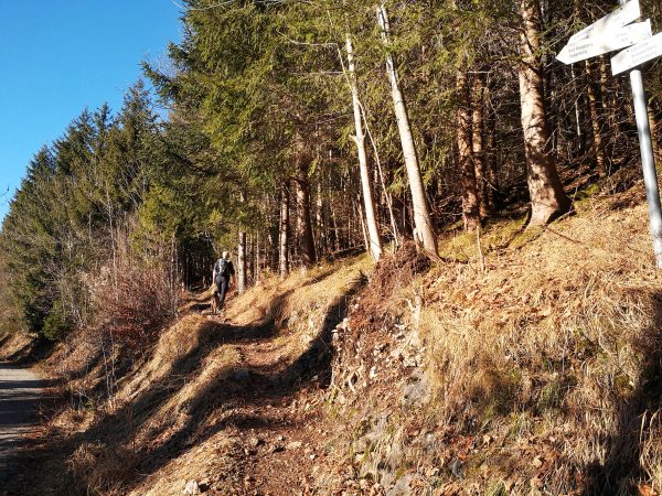 Kurz hinter der Kapelle zweigt links der schmale Wanderweg ab. Wir bleiben auf der bei Schnee leichter begehbaren Zufahrt.