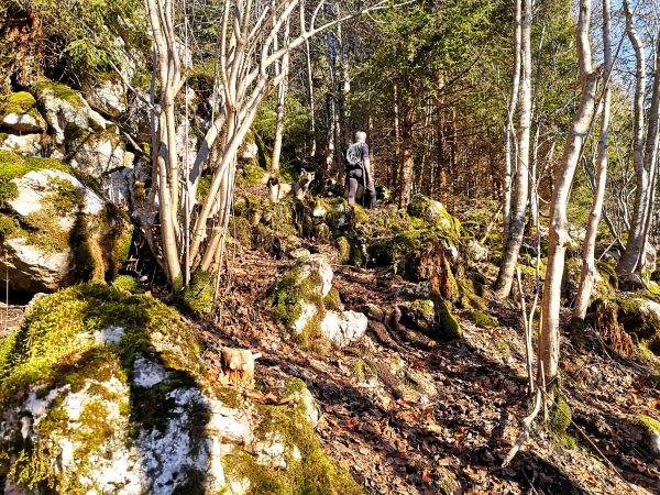 Durch lichten Wald mit moosbedeckten Felsen bergauf.