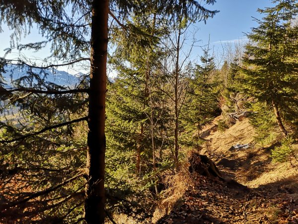 Aussichtspunkt über Bad Hindelang an der breiteren Forststraße. Direkt gegenüber zweigt der Bergpfad ab.