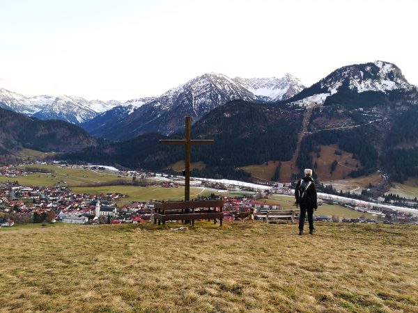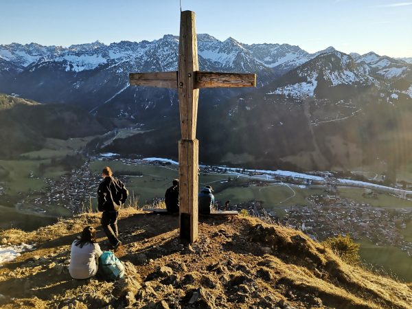 Großartiger Balkon über Bad Hindelang: das Gipfelkreuz des Hindelanger Hirschbergs mit Bänken und weitem Blick. Der eigentliche Gipfel ist baumbestanden.