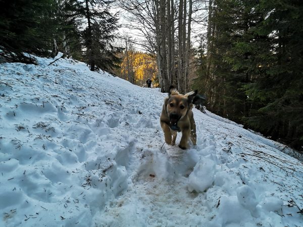 An der Nordseite ist der Schnee liegen geblieben. Amos freut`s wie irre.