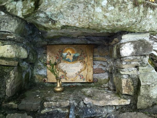 Am Wegrand: ein Brunnen mit einer Mahnung.