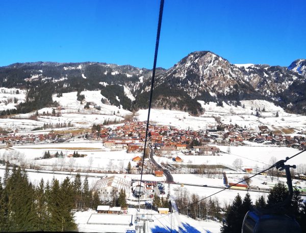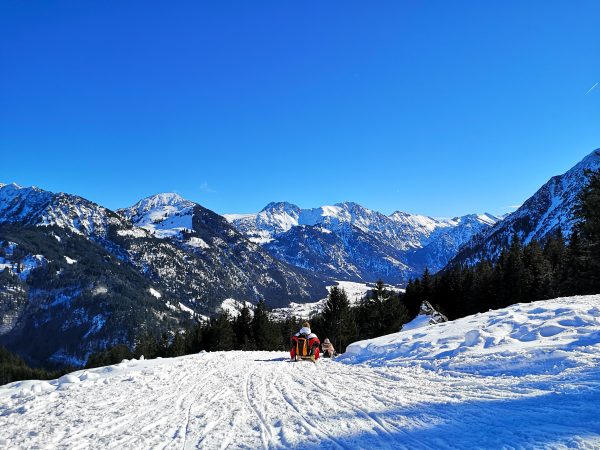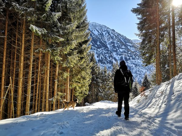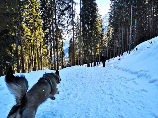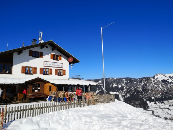 Das Imberger Horn ist eine beliebte Aussichtskanzel über Bad Hindelang im Allgäu. Beliebt auch deshalb, weil man mit der Hornbahn ohne Anstrengung auf 1.314 Höhe schweben kann. Im Schnee lockt der Berg Rodler und Wanderer an. Das große Plus: Für beide Gruppen gibt es eigene Spuren, man kommt sich also nicht in die Quere. Weiterer Pluspunkt: Der Winterwanderweg von der Bergstation ins Tal wird gewalzt. Mensch und Hund versinken nie im Tiefschnee. Mit herrlichem Panoramablick, von kurzen Waldstücken unterbrochen, lässt`s sich hier ganz bequem ohne Schneeschuhe spazieren. Hinab wie wir oder eben hinauf, wenn`s ein wenig fordernder sein soll.